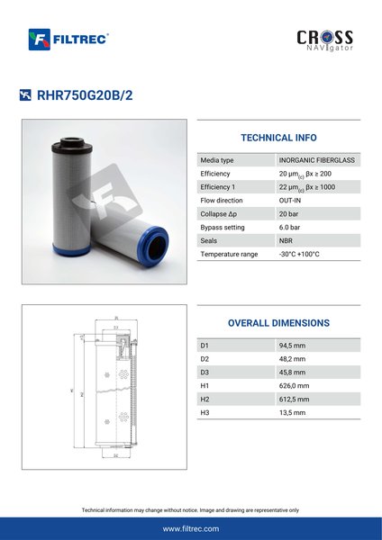 Genuine Filtrec RHR750G20B/2. This Filtrec element is designed to meet or exceed the quality and performance of brand OEM’s ensuring superior filtration performance and long-lasting durability.
