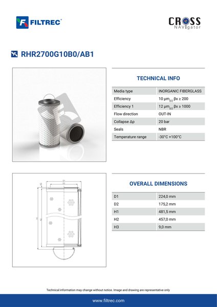 Genuine Filtrec RHR2700G10B0/AB1. This Filtrec element is designed to meet or exceed the quality and performance of brand OEM’s ensuring superior filtration performance and long-lasting durability.Engineered with their high performance media and a durable design, the RHR2700G10B0/AB1 provides reliable and consistent performance over its lifespan, even in harsh operating environments. When you order from FilterFinder, you can trust that you are getting a reliable and high-quality replacement filter that will keep your system running smoothly.