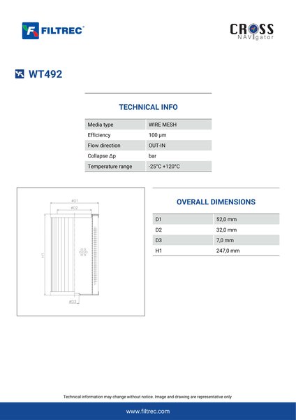 Genuine Filtrec WT492. This Filtrec element is designed to meet or exceed the quality and performance of brand OEM’s ensuring superior filtration performance and long-lasting durability.
