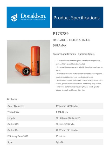 Donaldson P173789 Hydraulic Filter, Spin-On Duramax | Replaces the FilterFinder FF216590B