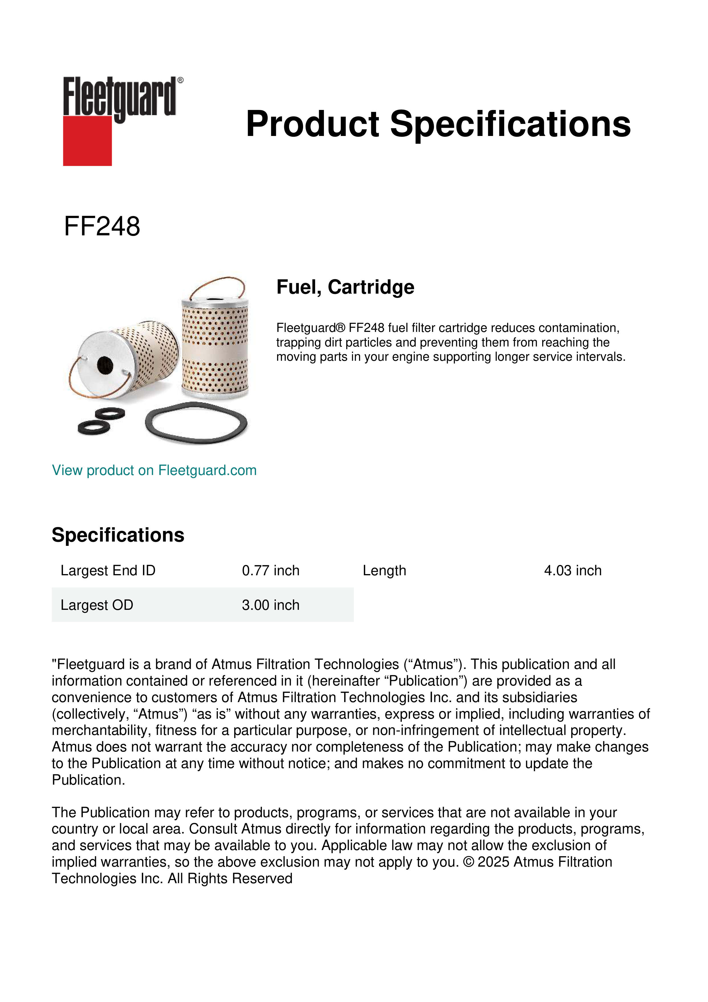 Fleetguard® FF248 fuel filter cartridge reduces contamination, trapping dirt particles and preventing them from reaching the moving parts in your engine supporting longer service intervals.Specification