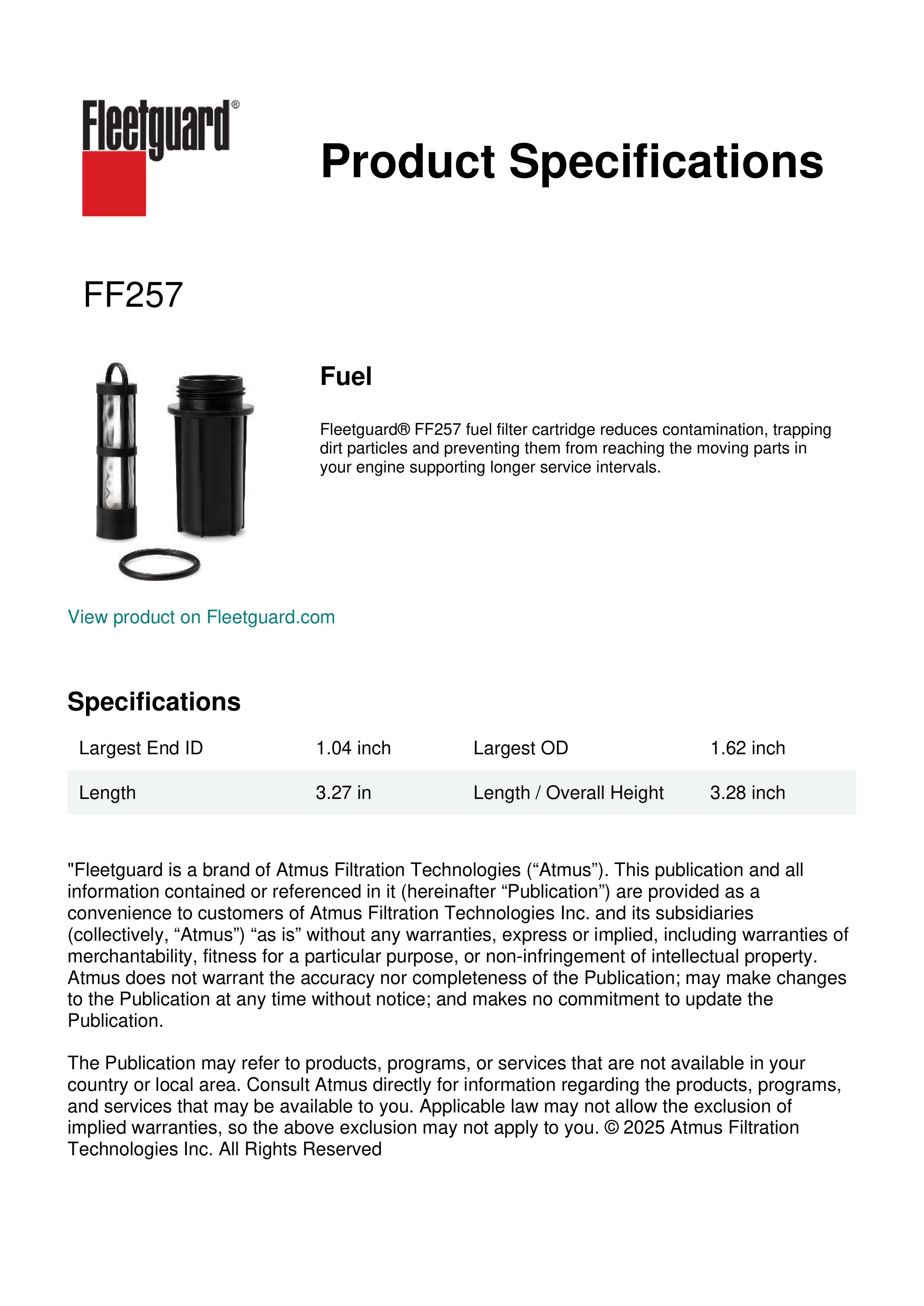 Fleetguard® FF257 fuel filter cartridge reduces contamination, trapping dirt particles and preventing them from reaching the moving parts in your engine supporting longer service intervals.Specification