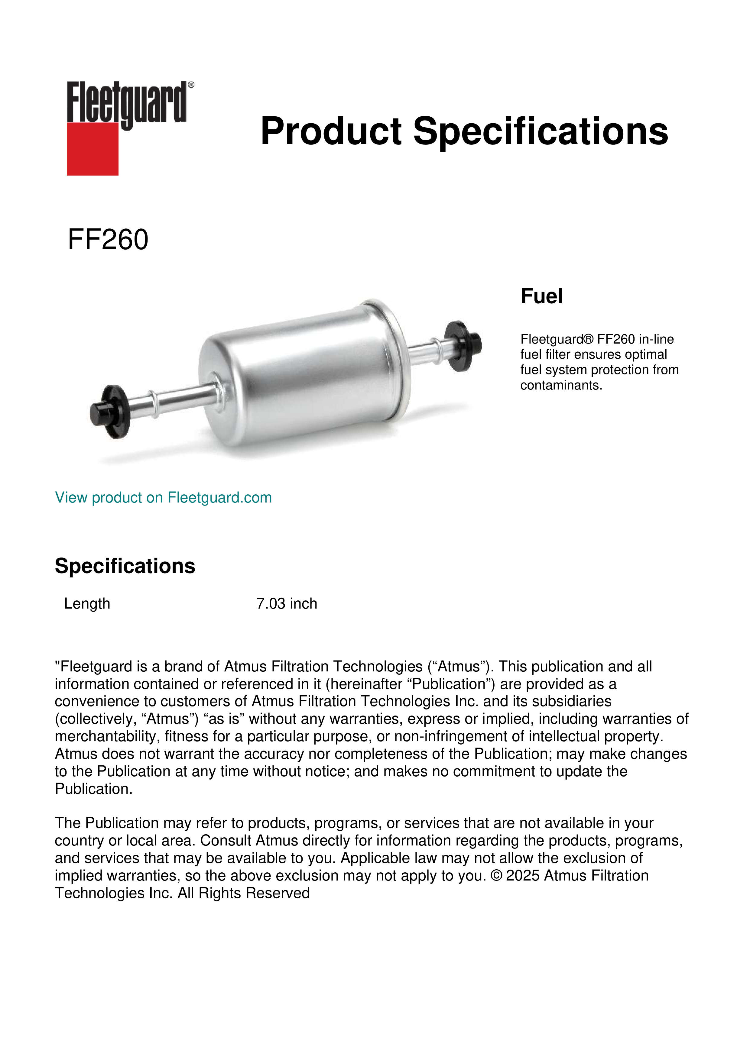 Fleetguard® FF260 in-line fuel filter ensures optimal fuel system protection from contaminants.Specification