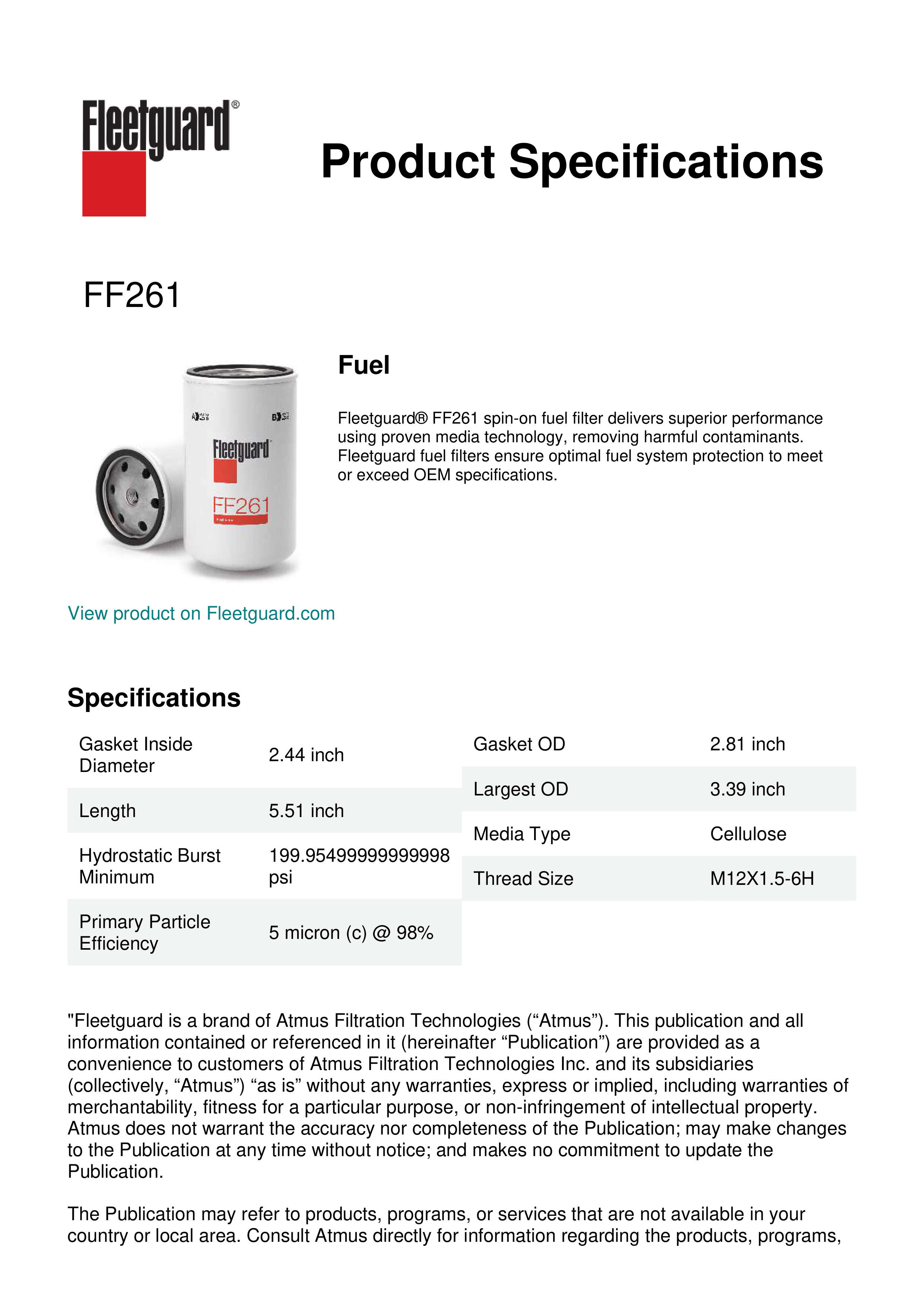 Fleetguard® FF261 spin-on fuel filter delivers superior performance using proven media technology, removing harmful contaminants. Fleetguard fuel filters ensure optimal fuel system protection to meet or exceed OEM specifications.Specification