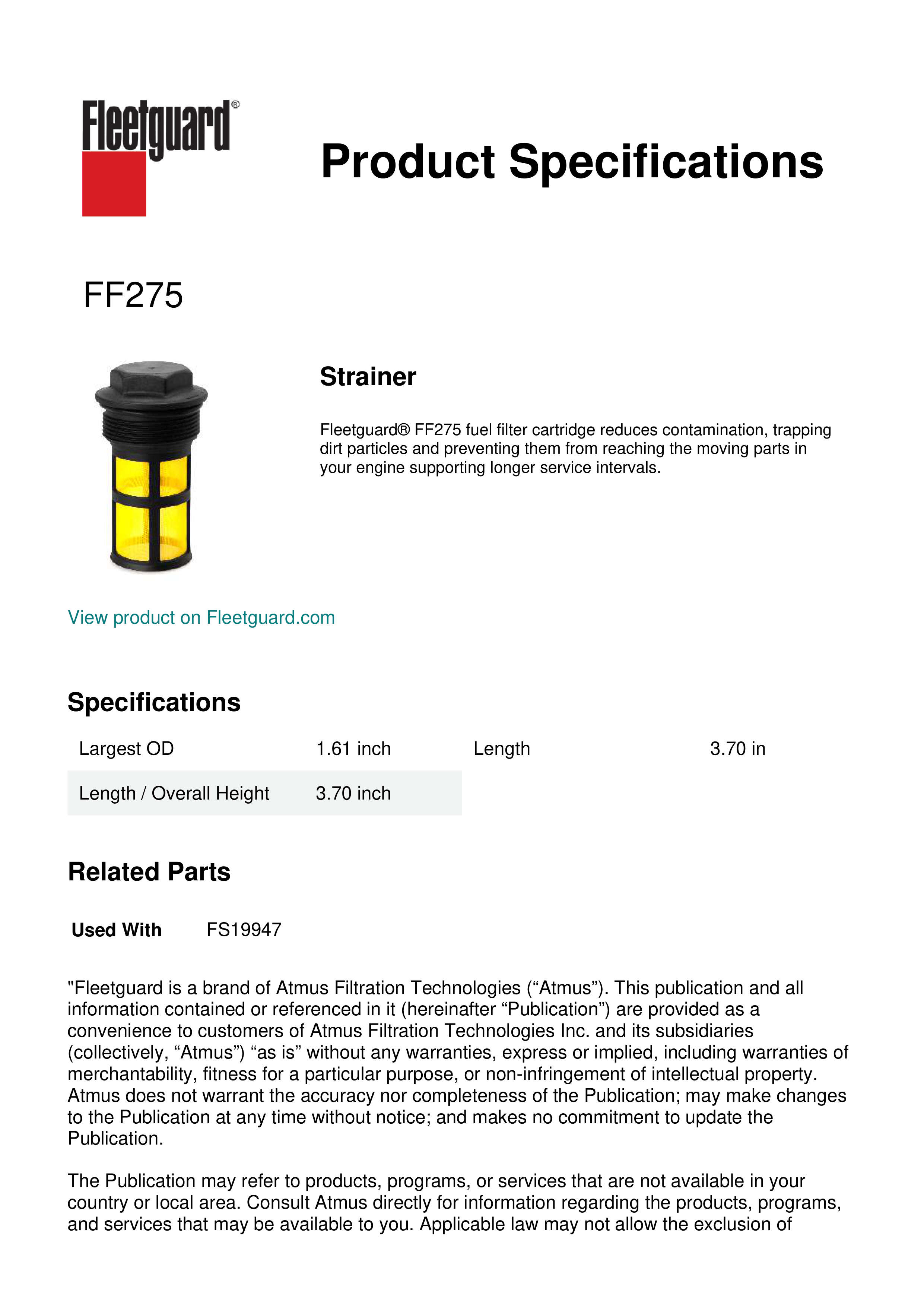 Fleetguard® FF275 fuel filter cartridge reduces contamination, trapping dirt particles and preventing them from reaching the moving parts in your engine supporting longer service intervals.Specification