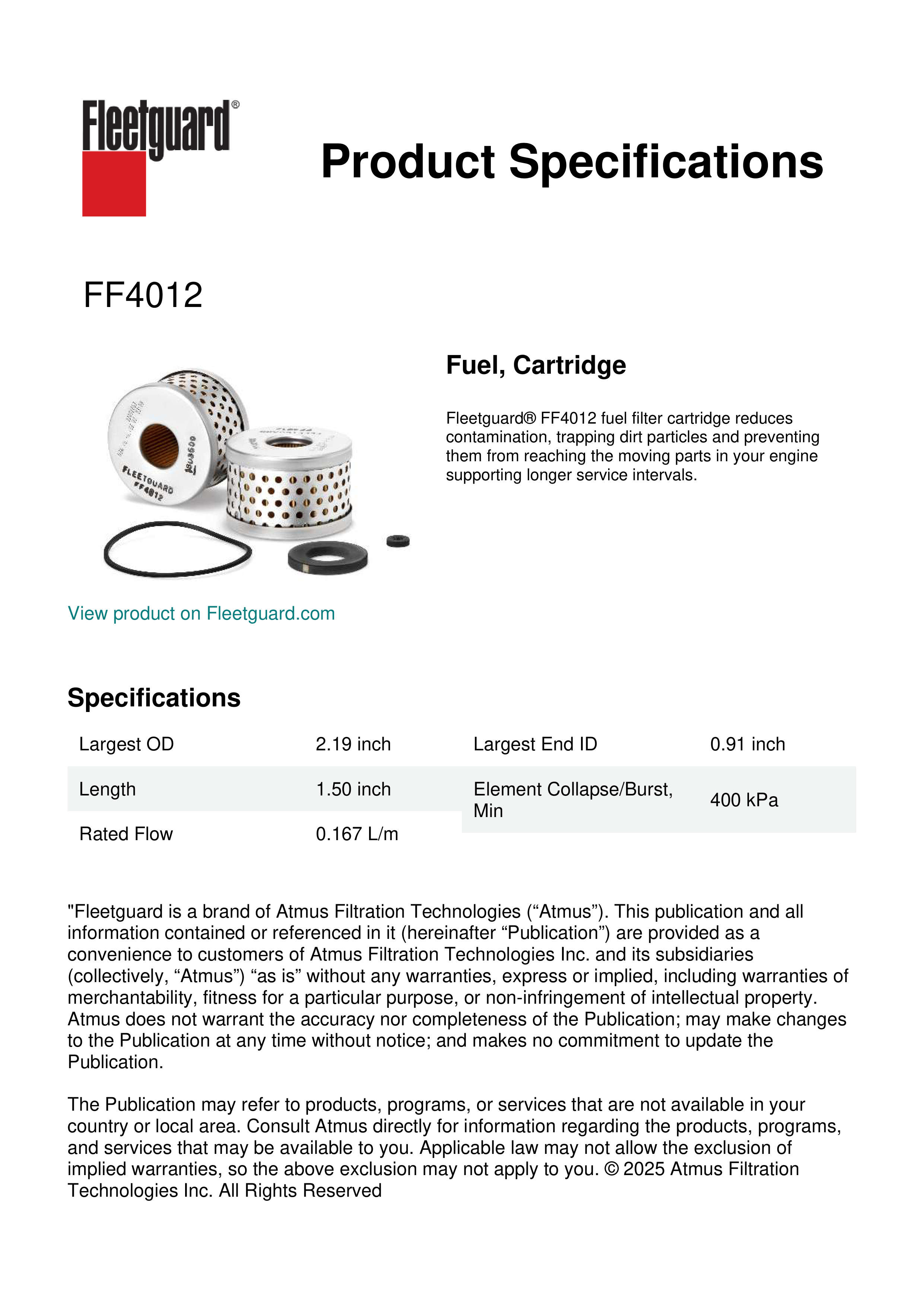Fleetguard® FF4012 fuel filter cartridge reduces contamination, trapping dirt particles and preventing them from reaching the moving parts in your engine supporting longer service intervals.Specification