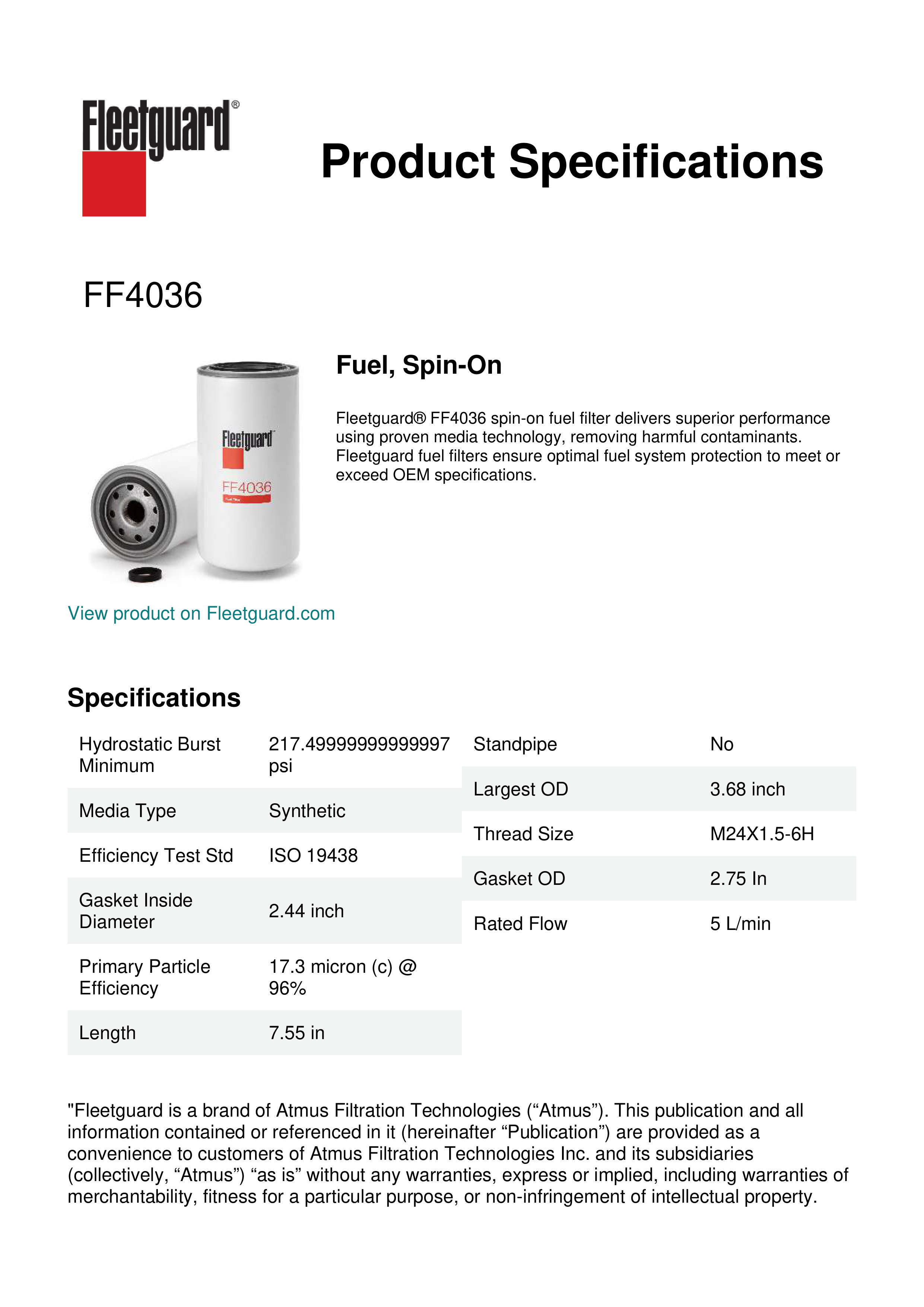 Fleetguard® FF4036 spin-on fuel filter delivers superior performance using proven media technology, removing harmful contaminants. Fleetguard fuel filters ensure optimal fuel system protection to meet or exceed OEM specifications.Specification