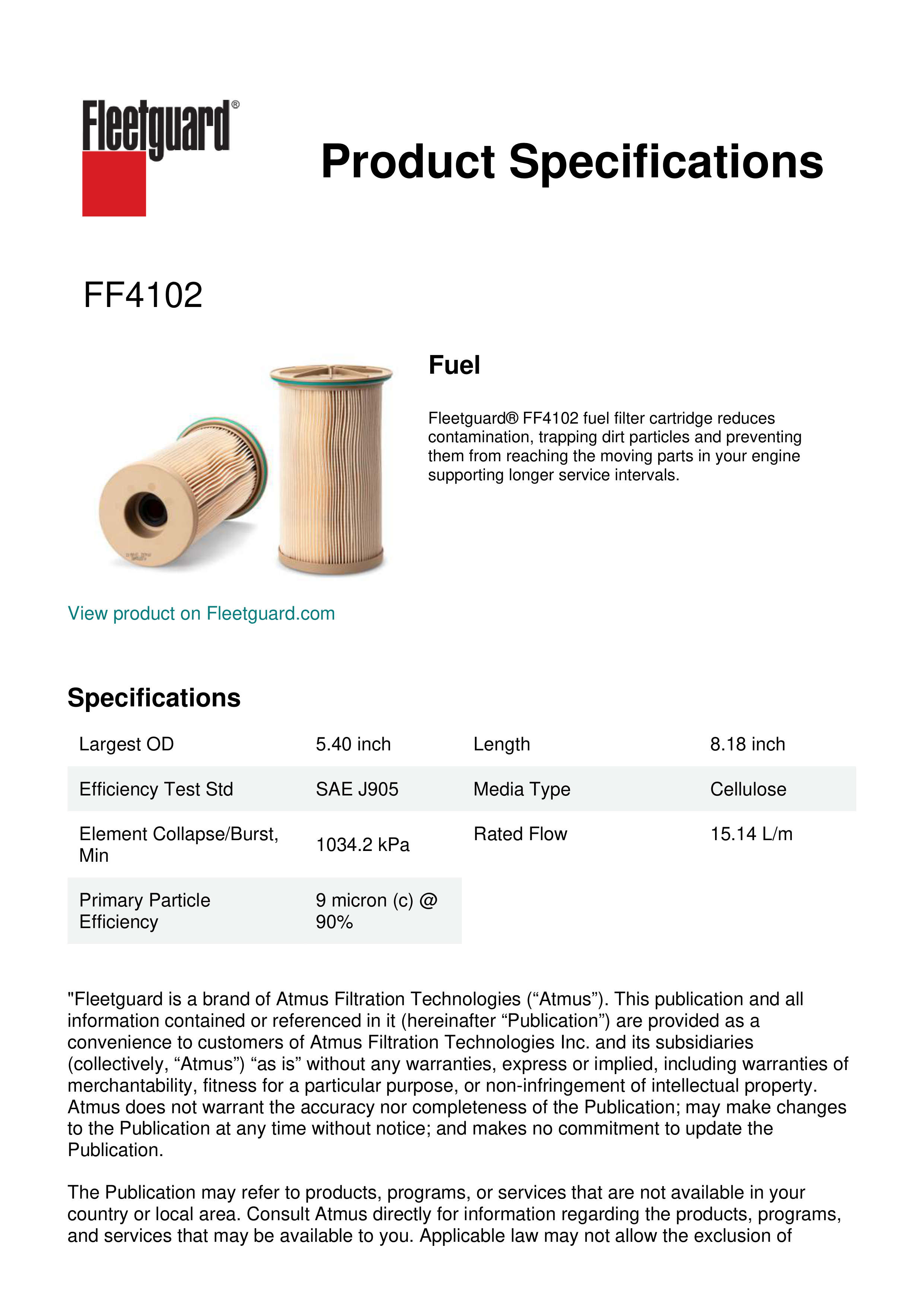 Fleetguard® FF4102 fuel filter cartridge reduces contamination, trapping dirt particles and preventing them from reaching the moving parts in your engine supporting longer service intervals.Specification