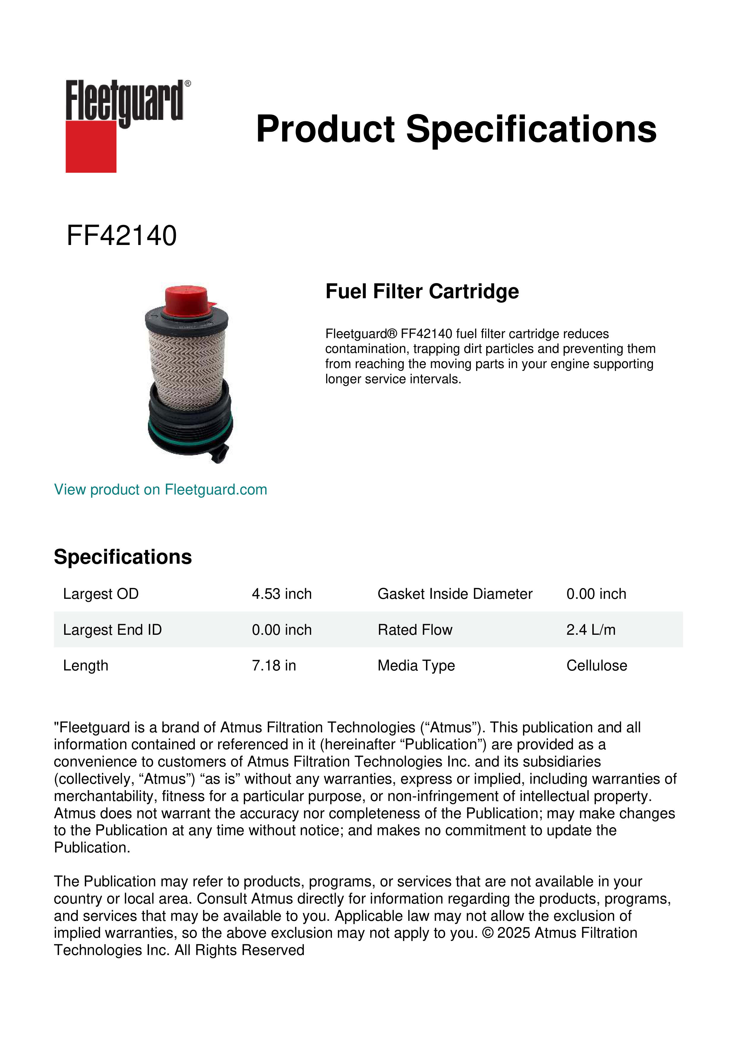 Fleetguard® FF42140 fuel filter cartridge reduces contamination, trapping dirt particles and preventing them from reaching the moving parts in your engine supporting longer service intervals.Specification