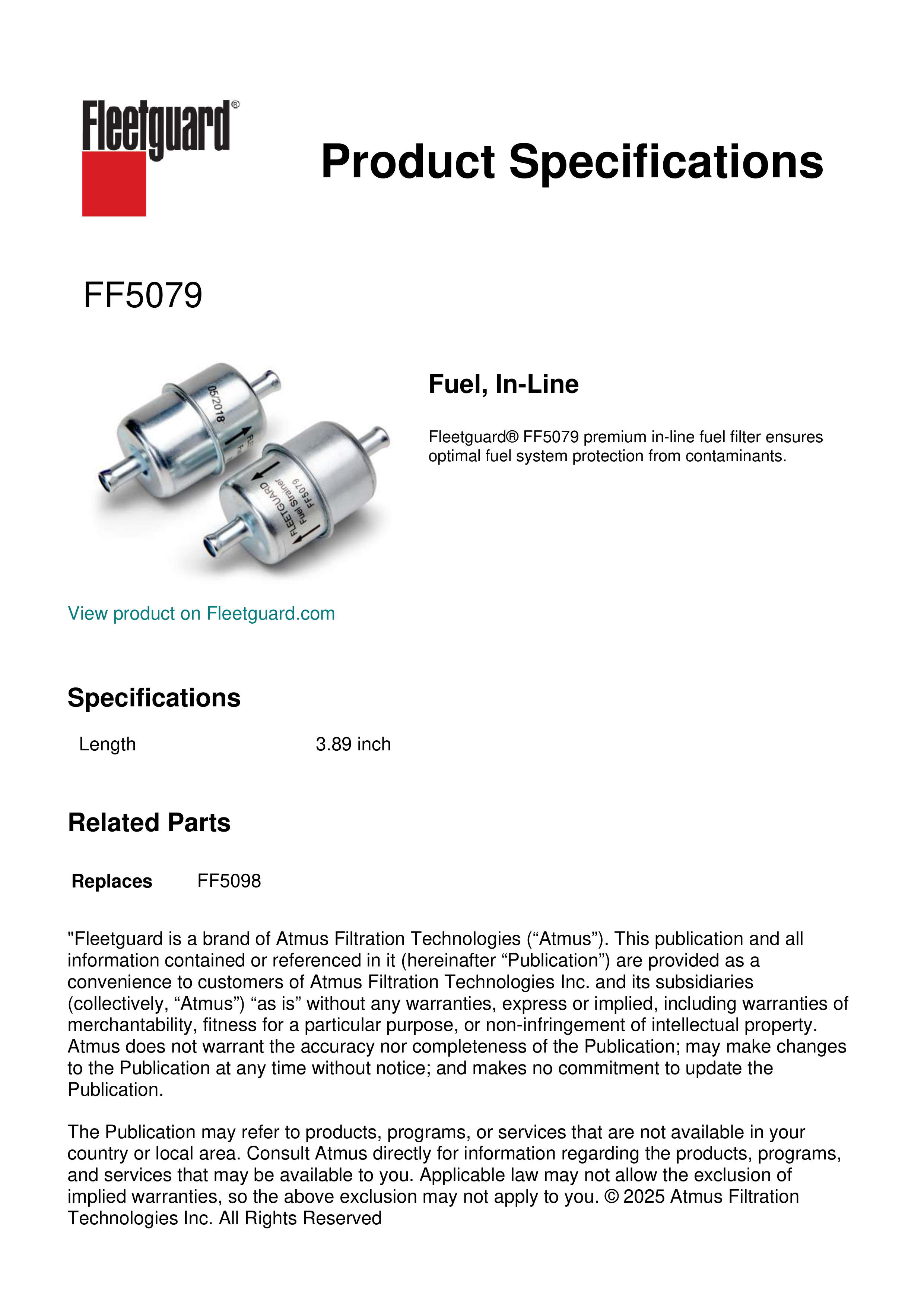 Fleetguard® FF5079 premium in-line fuel filter ensures optimal fuel system protection from contaminants.Specification