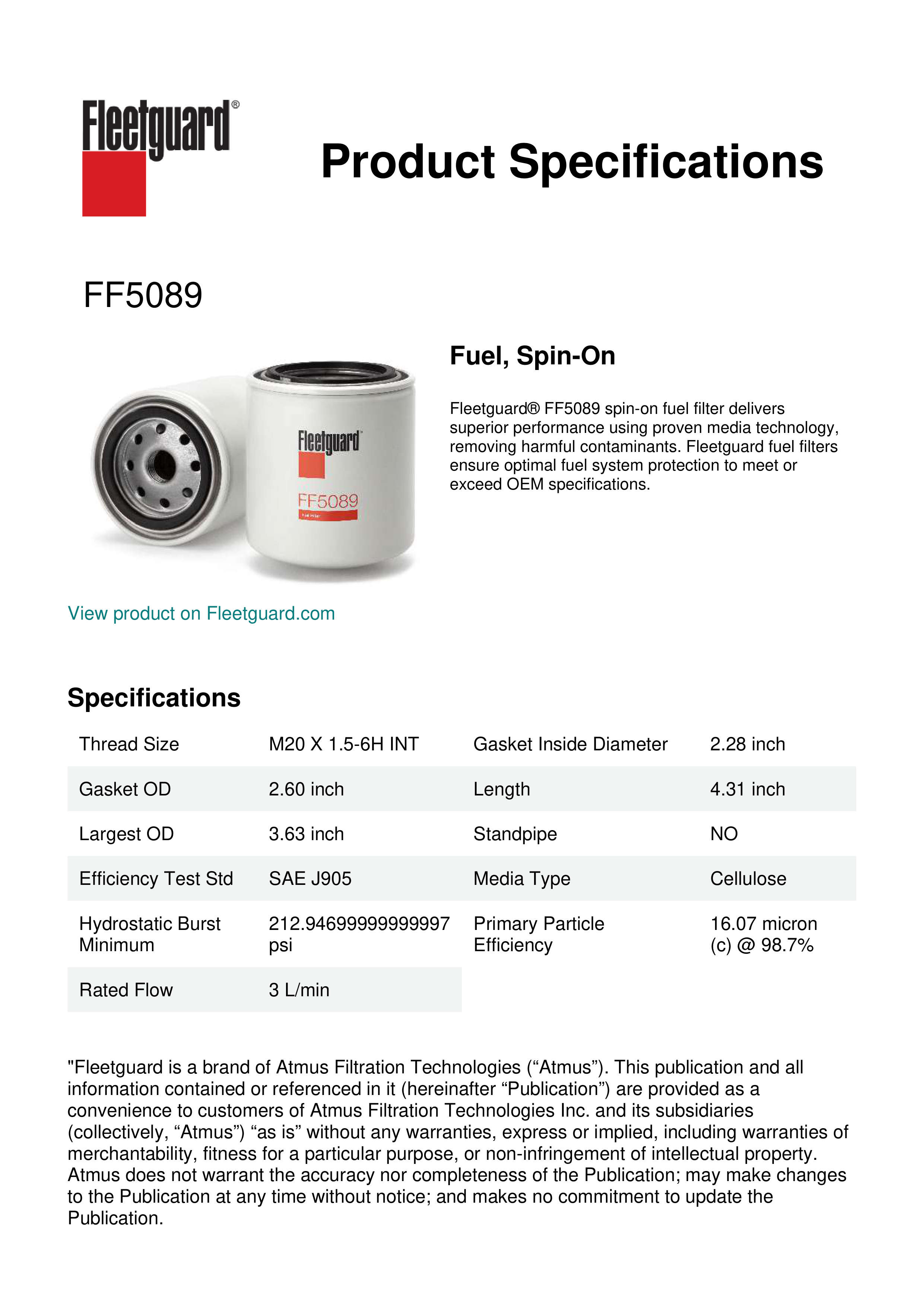 Fleetguard® FF5089 spin-on fuel filter delivers superior performance using proven media technology, removing harmful contaminants. Fleetguard fuel filters ensure optimal fuel system protection to meet or exceed OEM specifications.Specification
