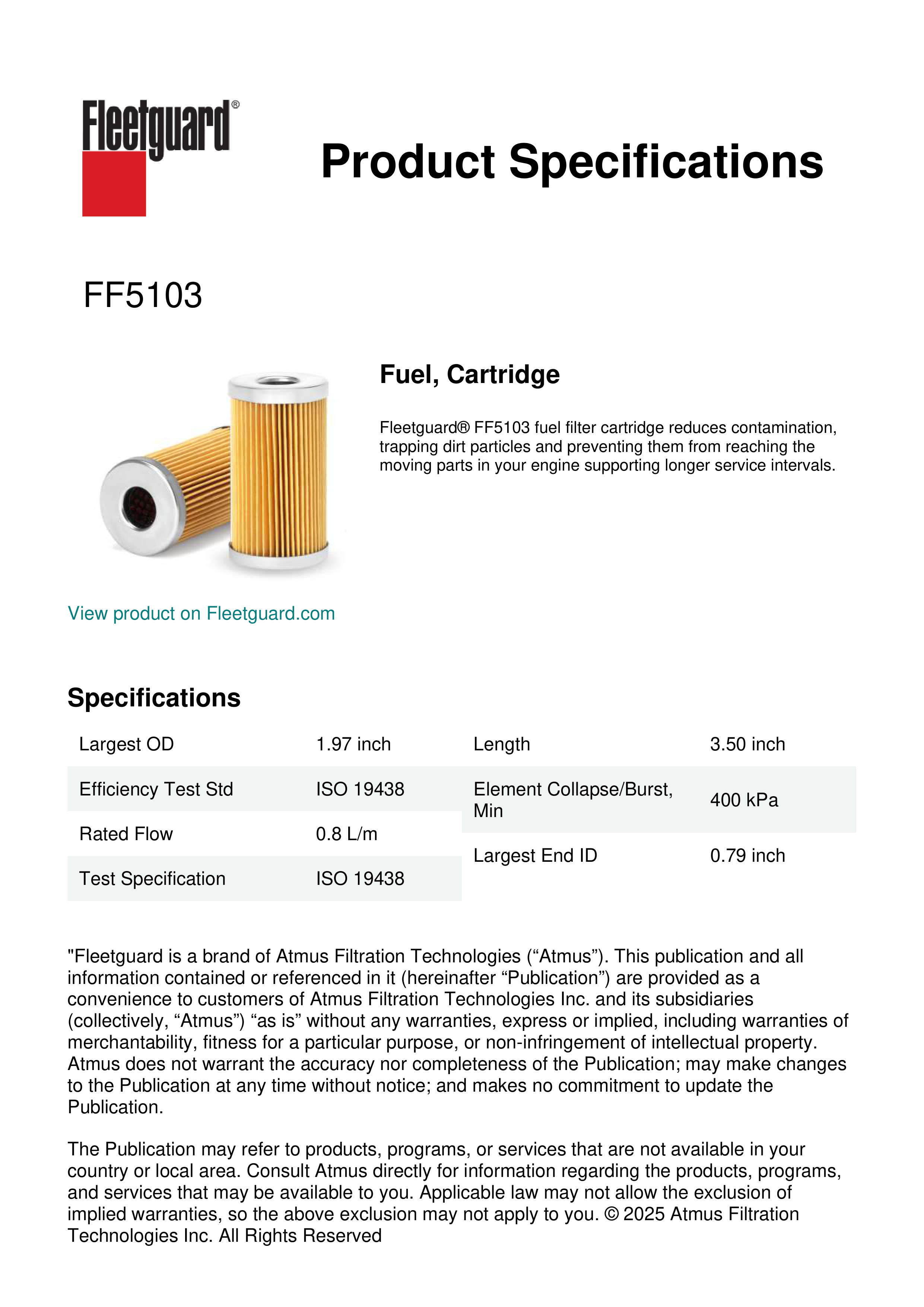 Fleetguard® FF5103 fuel filter cartridge reduces contamination, trapping dirt particles and preventing them from reaching the moving parts in your engine supporting longer service intervals.Specification