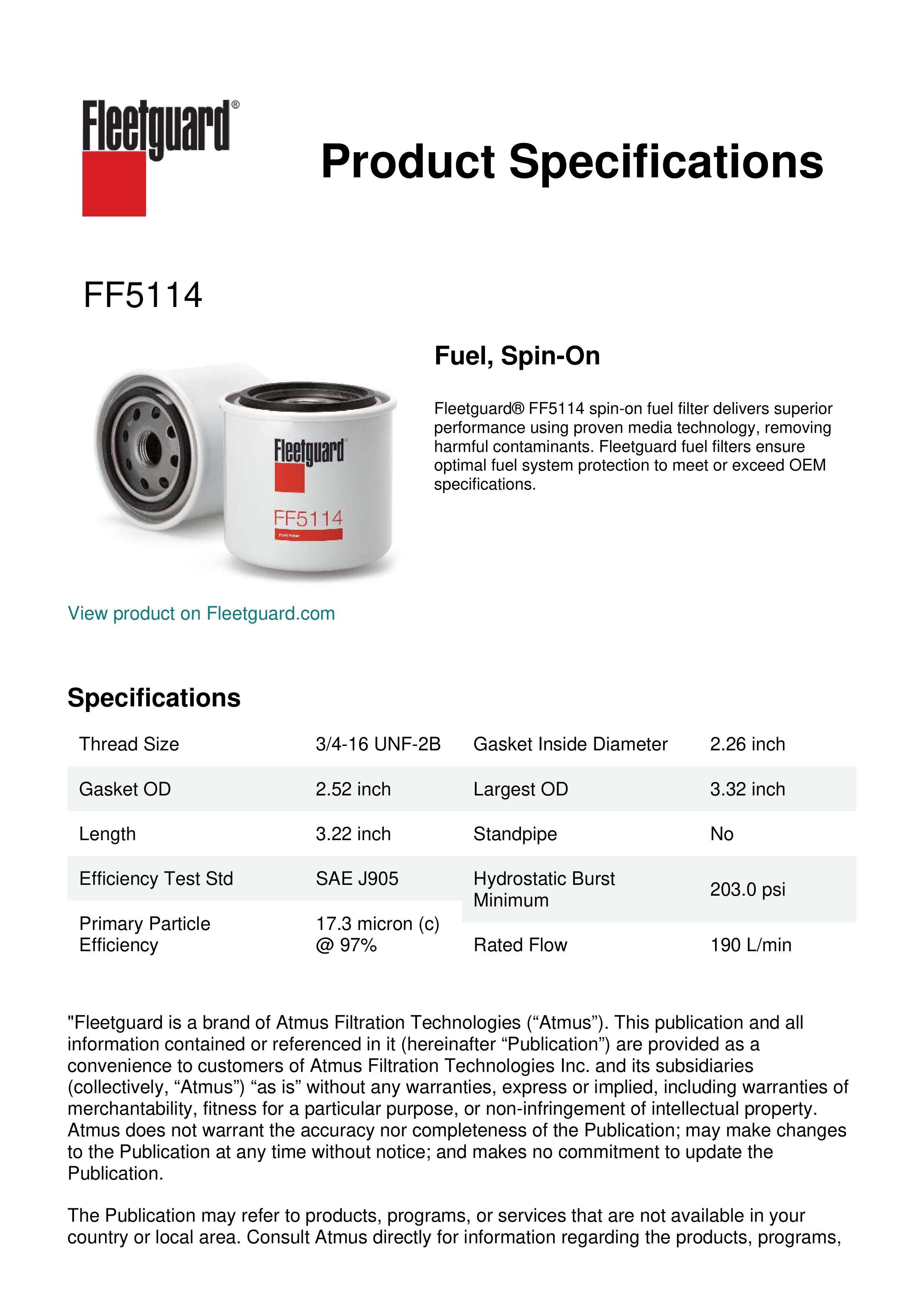 Fleetguard® FF5114 spin-on fuel filter delivers superior performance using proven media technology, removing harmful contaminants. Fleetguard fuel filters ensure optimal fuel system protection to meet or exceed OEM specifications.Specification