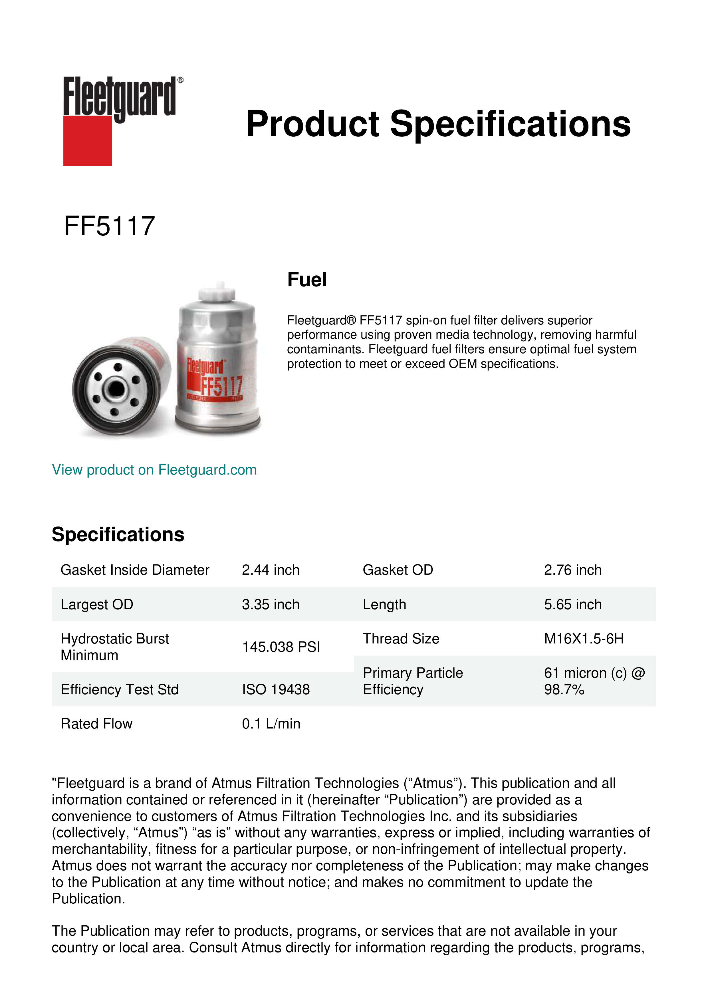 Fleetguard® FF5117 spin-on fuel filter delivers superior performance using proven media technology, removing harmful contaminants. Fleetguard fuel filters ensure optimal fuel system protection to meet or exceed OEM specifications.Specification