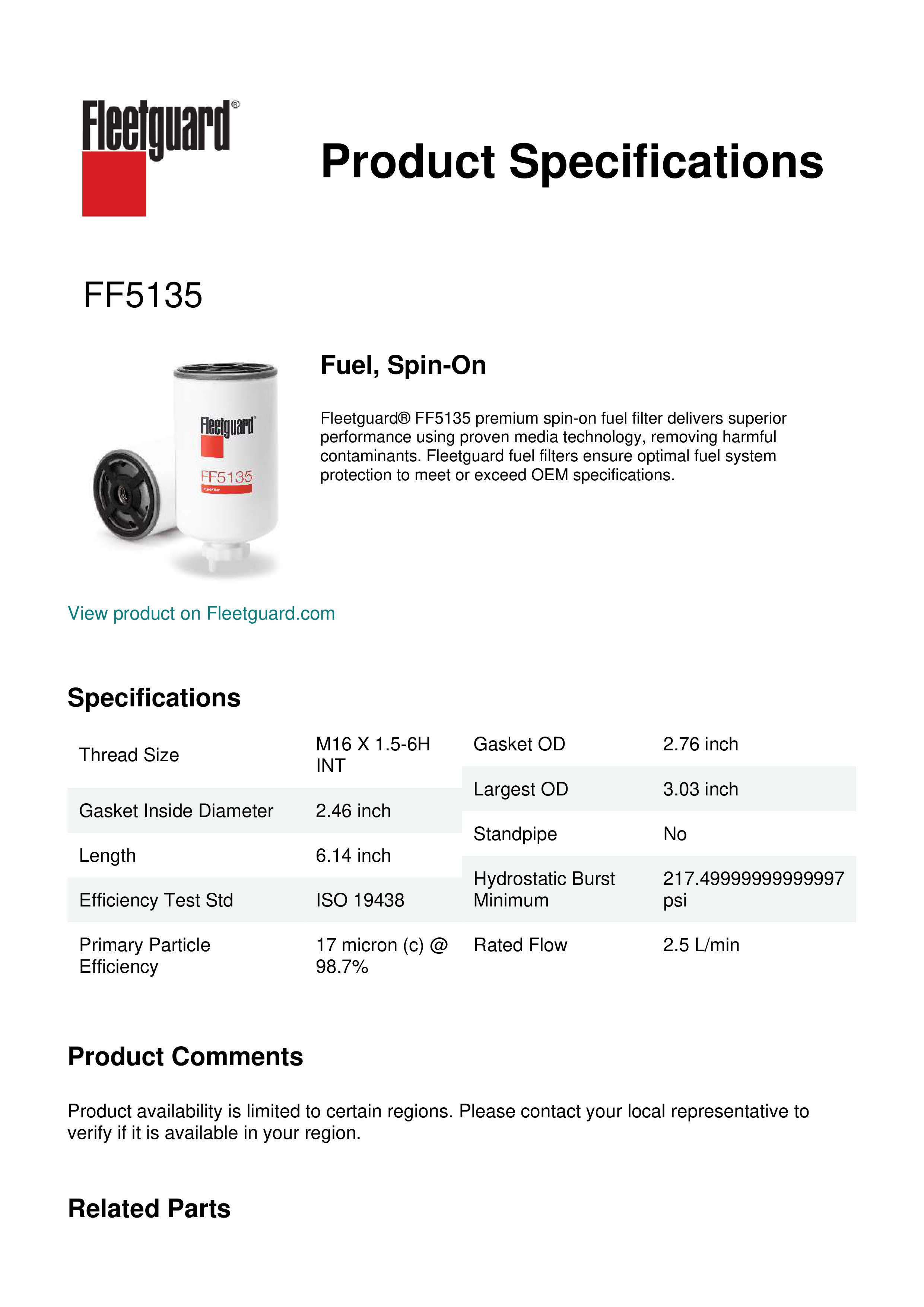 Fleetguard® FF5135 premium spin-on fuel filter delivers superior performance using proven media technology, removing harmful contaminants. Fleetguard fuel filters ensure optimal fuel system protection to meet or exceed OEM specifications.Specification