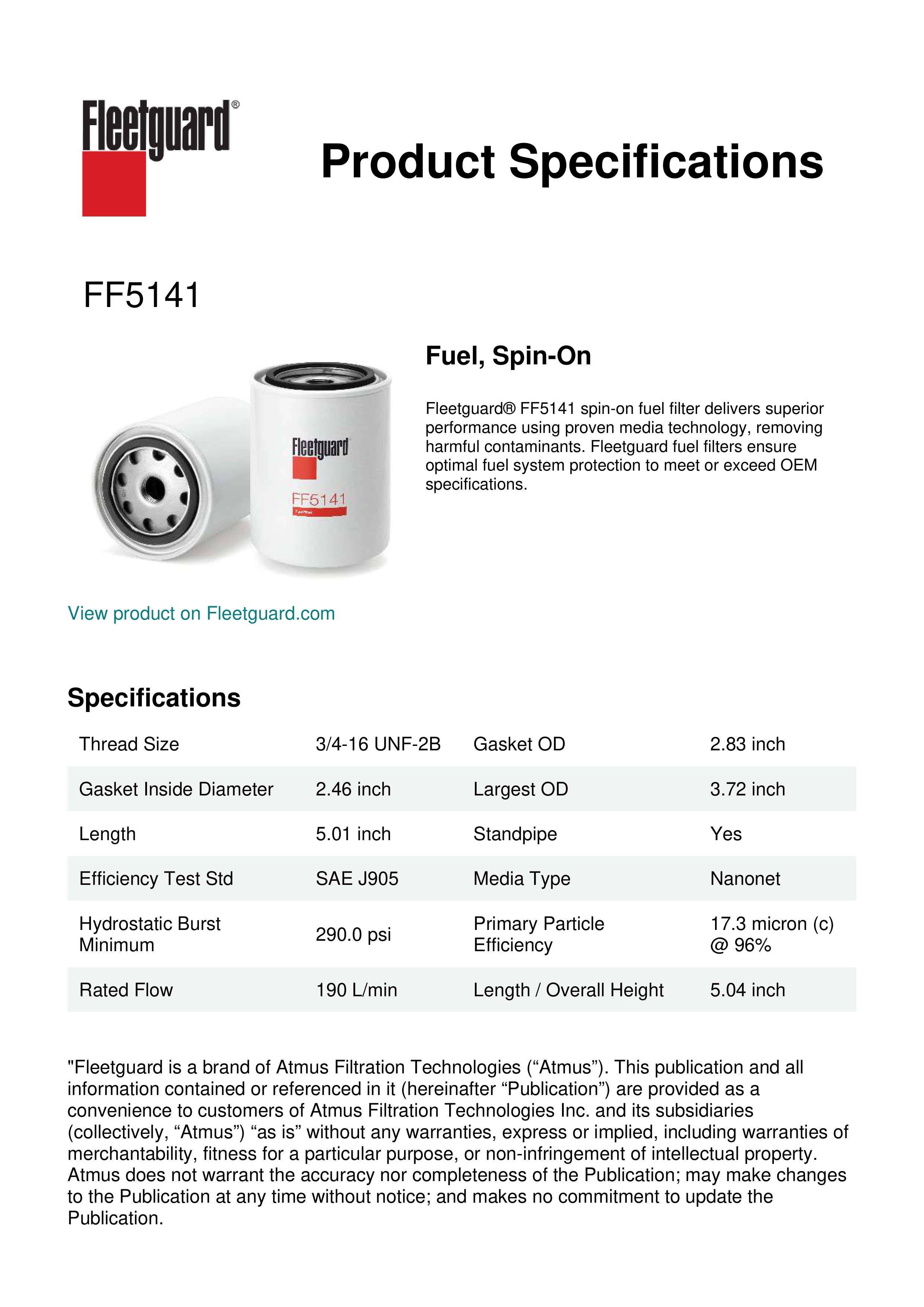 Fleetguard® FF5141 spin-on fuel filter delivers superior performance using proven media technology, removing harmful contaminants. Fleetguard fuel filters ensure optimal fuel system protection to meet or exceed OEM specifications.Specification