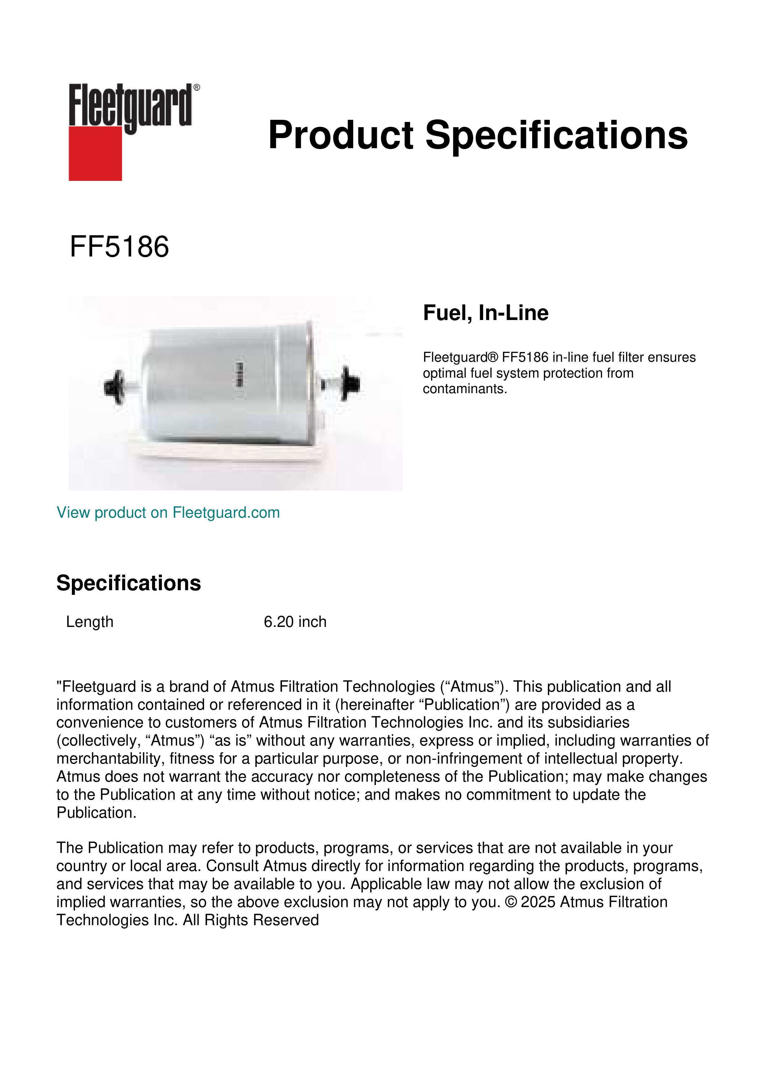Fleetguard® FF5186 in-line fuel filter ensures optimal fuel system protection from contaminants.Specification