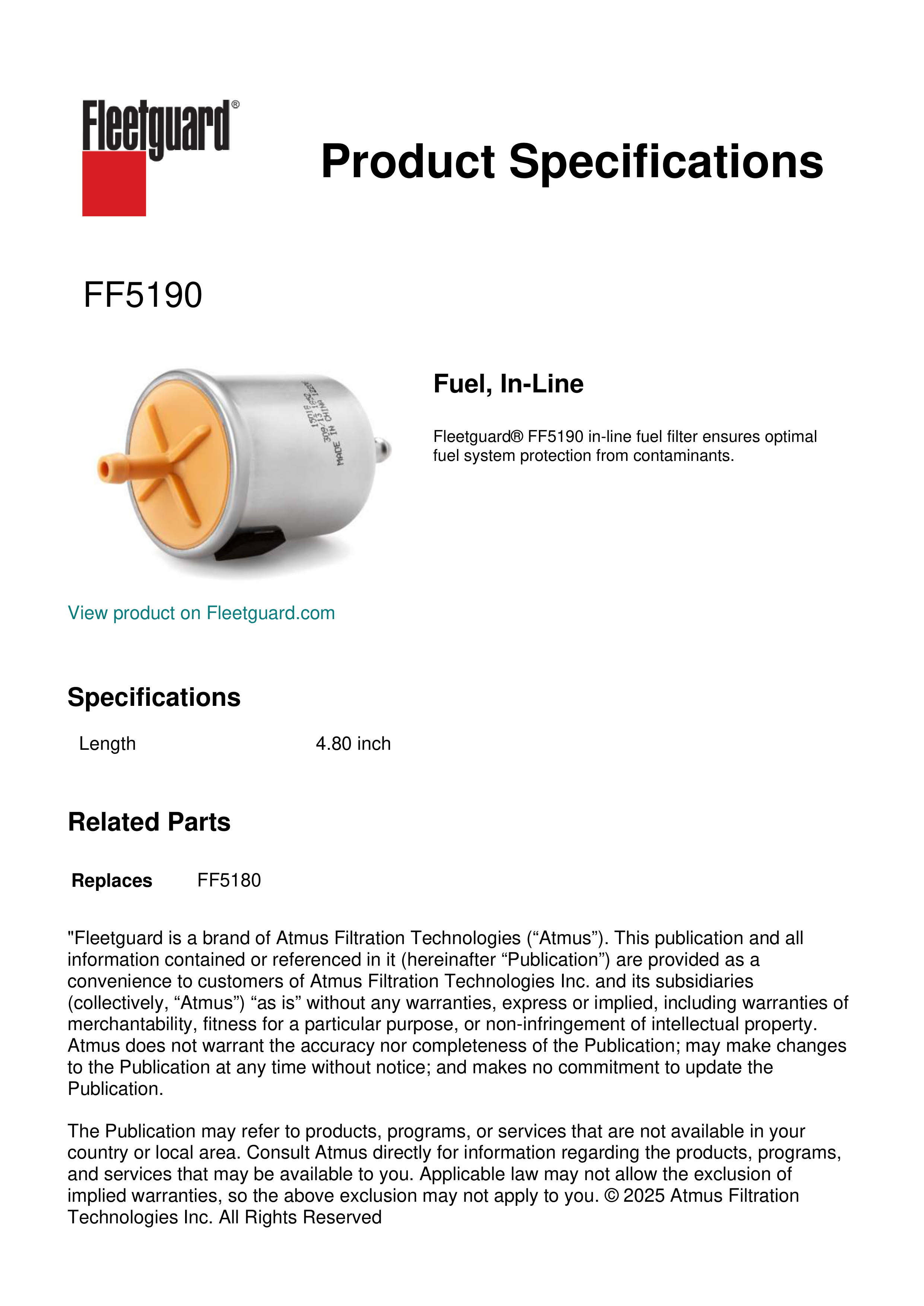 Fleetguard® FF5190 in-line fuel filter ensures optimal fuel system protection from contaminants.Specification