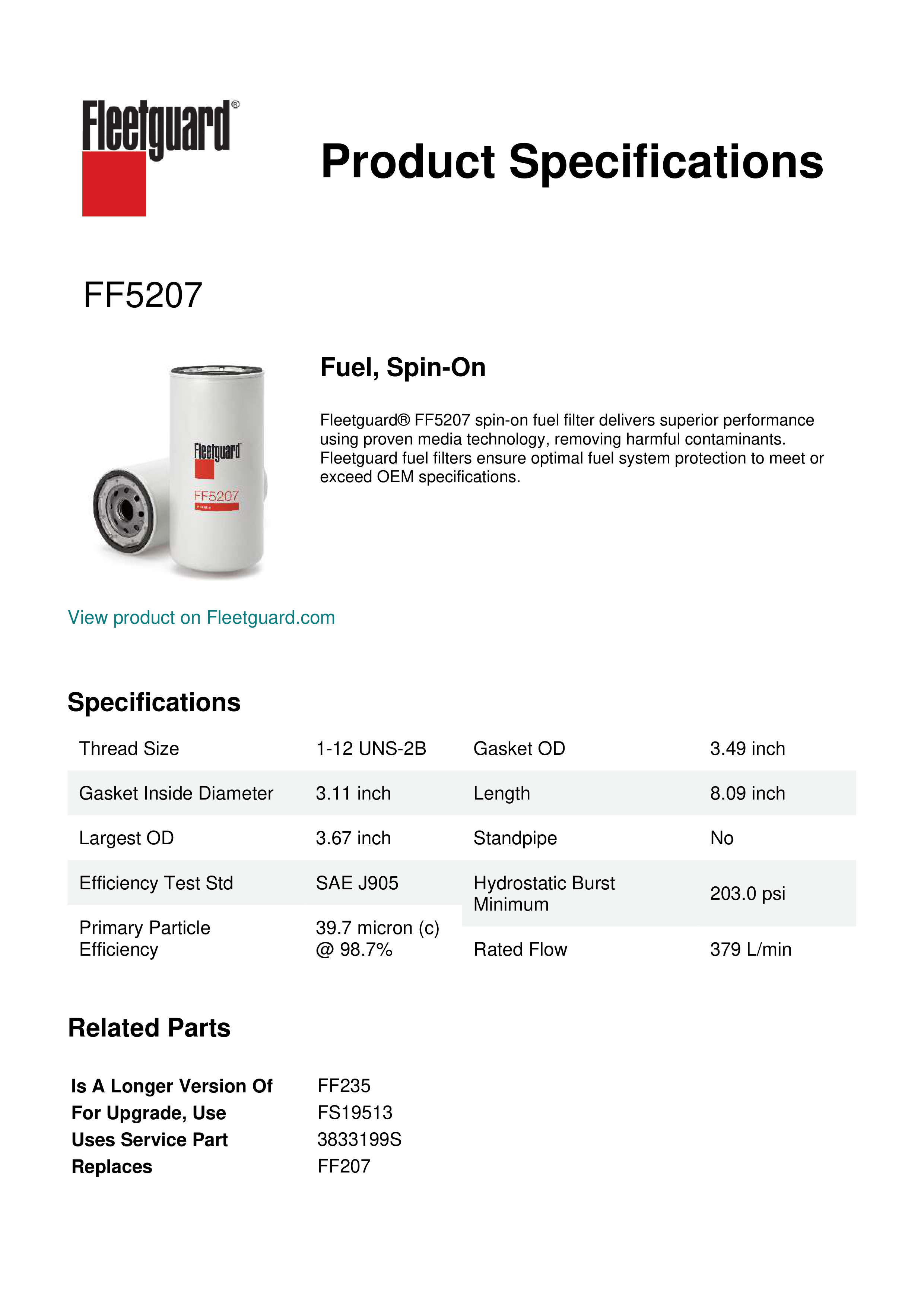 Fleetguard® FF5207 spin-on fuel filter delivers superior performance using proven media technology, removing harmful contaminants. Fleetguard fuel filters ensure optimal fuel system protection to meet or exceed OEM specifications.Specification