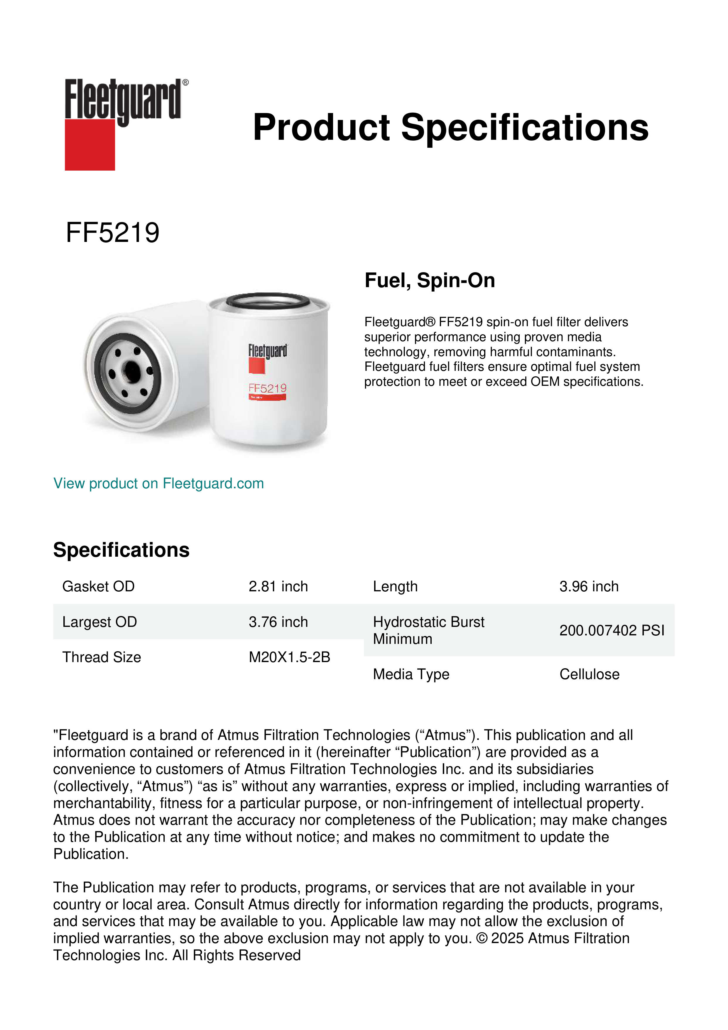 Fleetguard® FF5219 spin-on fuel filter delivers superior performance using proven media technology, removing harmful contaminants. Fleetguard fuel filters ensure optimal fuel system protection to meet or exceed OEM specifications.Specification