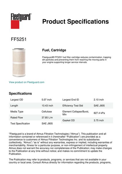 Fleetguard® FF5251 fuel filter cartridge reduces contamination, trapping dirt particles and preventing them from reaching the moving parts in your engine supporting longer service intervals.Specification