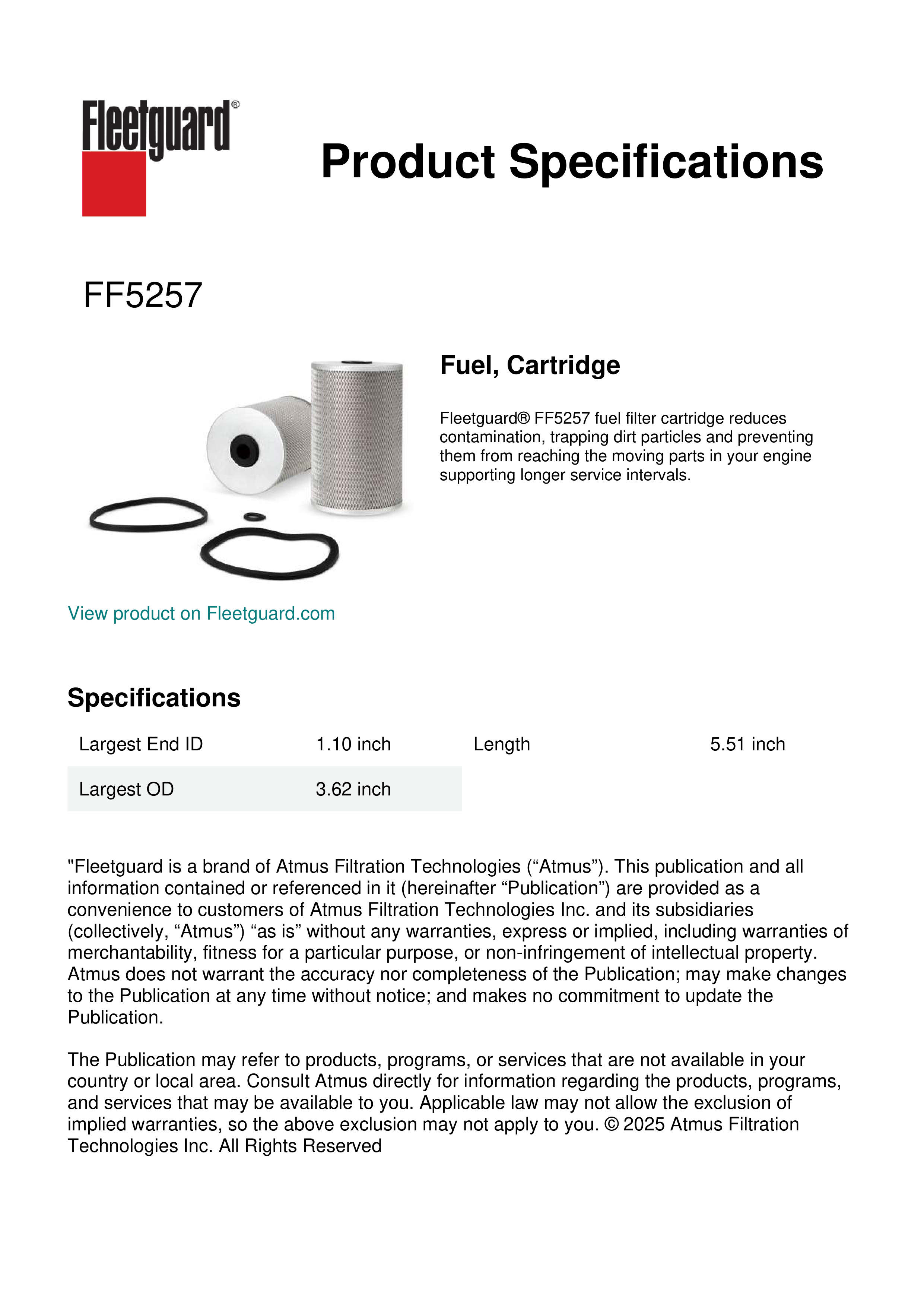 Fleetguard® FF5257 fuel filter cartridge reduces contamination, trapping dirt particles and preventing them from reaching the moving parts in your engine supporting longer service intervals.Specification