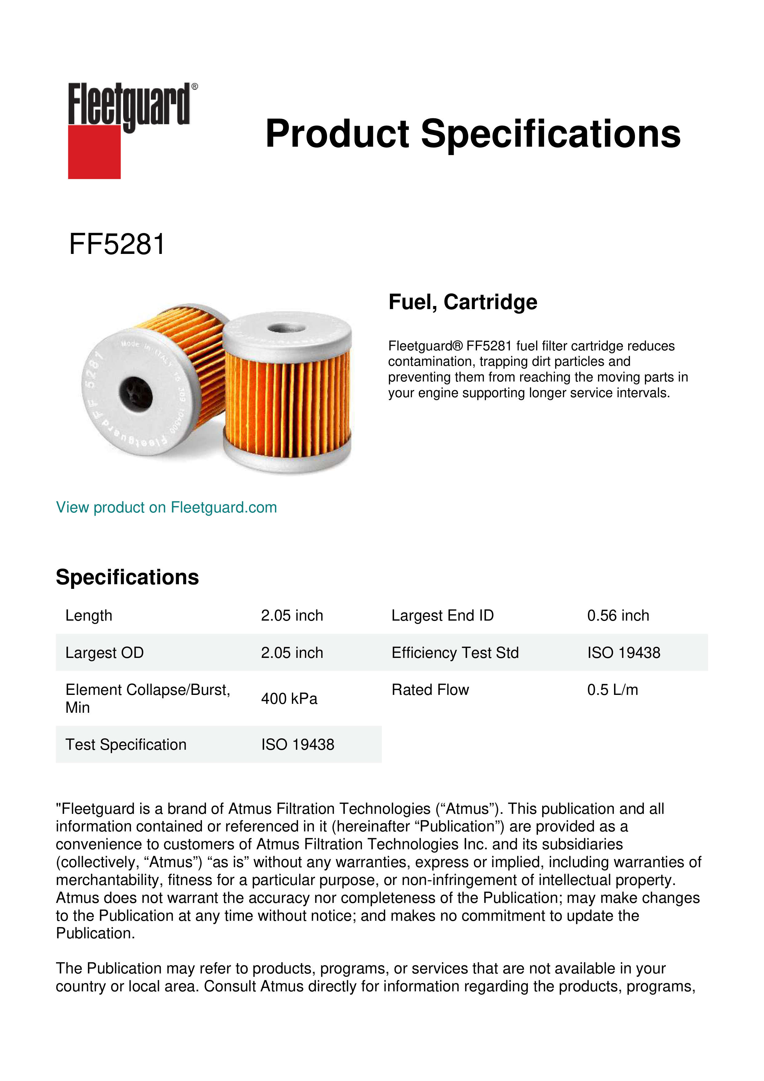 Fleetguard® FF5281 fuel filter cartridge reduces contamination, trapping dirt particles and preventing them from reaching the moving parts in your engine supporting longer service intervals.Specification
