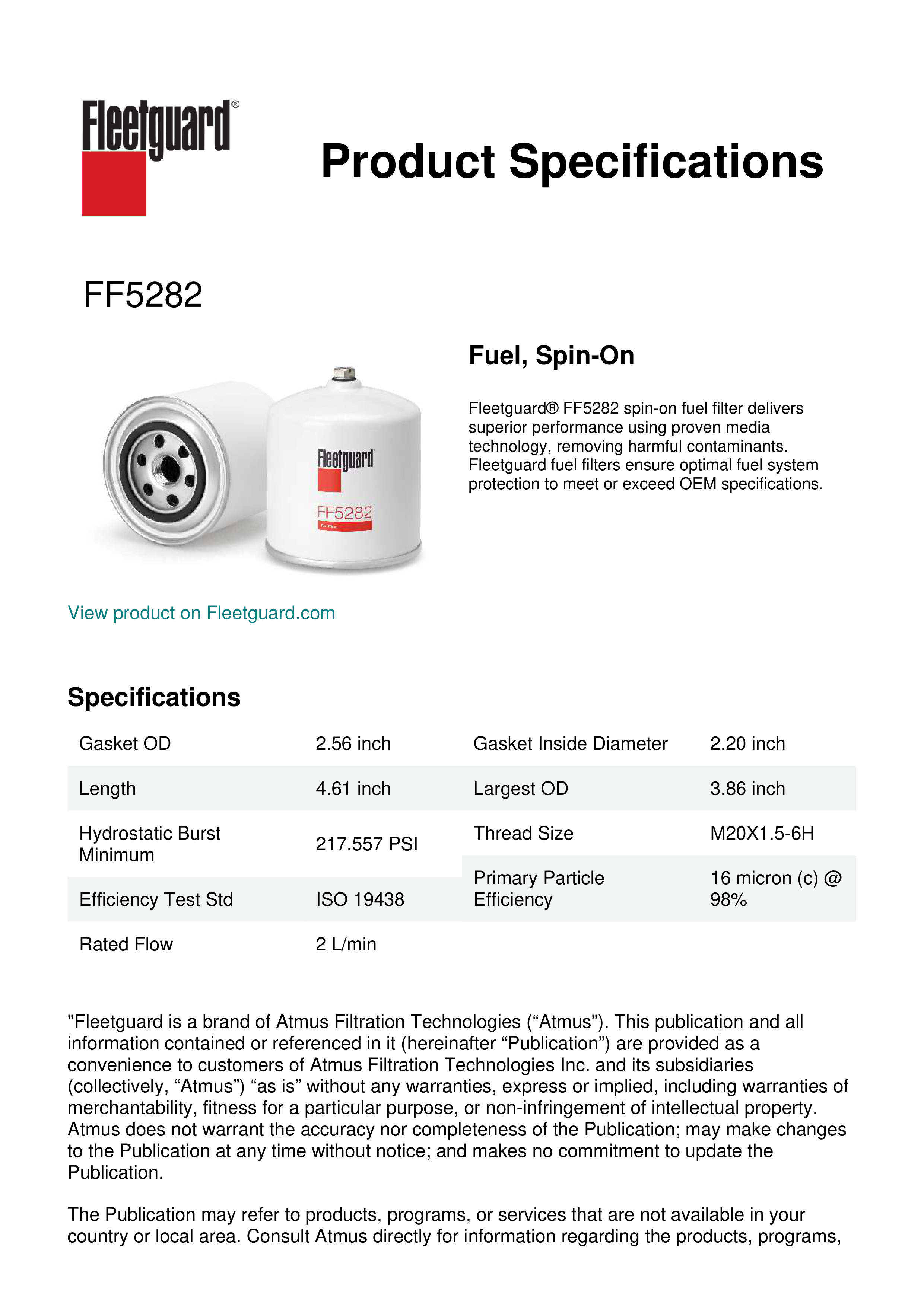 Fleetguard® FF5282 spin-on fuel filter delivers superior performance using proven media technology, removing harmful contaminants. Fleetguard fuel filters ensure optimal fuel system protection to meet or exceed OEM specifications.Specification