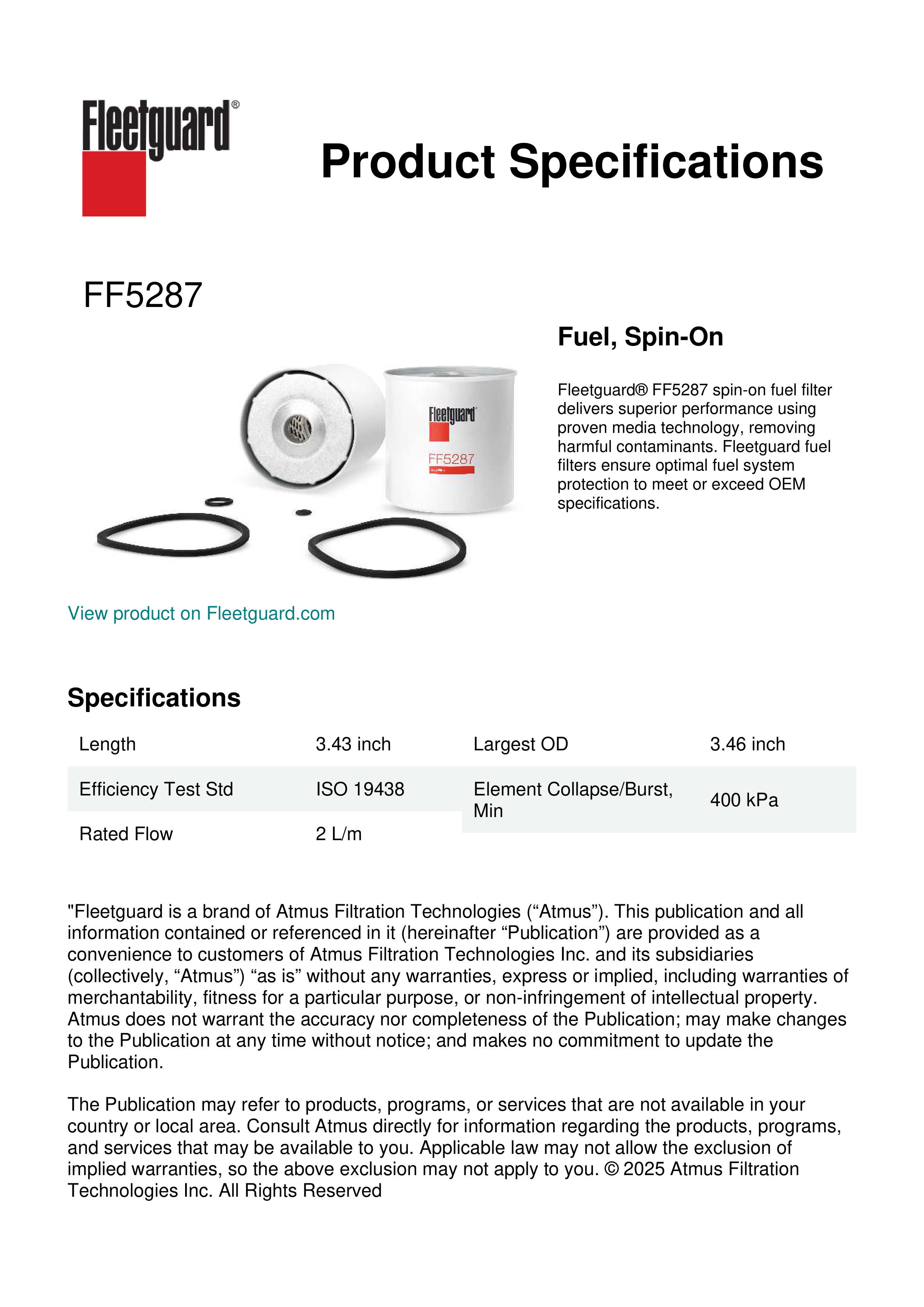 Fleetguard® FF5287 spin-on fuel filter delivers superior performance using proven media technology, removing harmful contaminants. Fleetguard fuel filters ensure optimal fuel system protection to meet or exceed OEM specifications.Specification