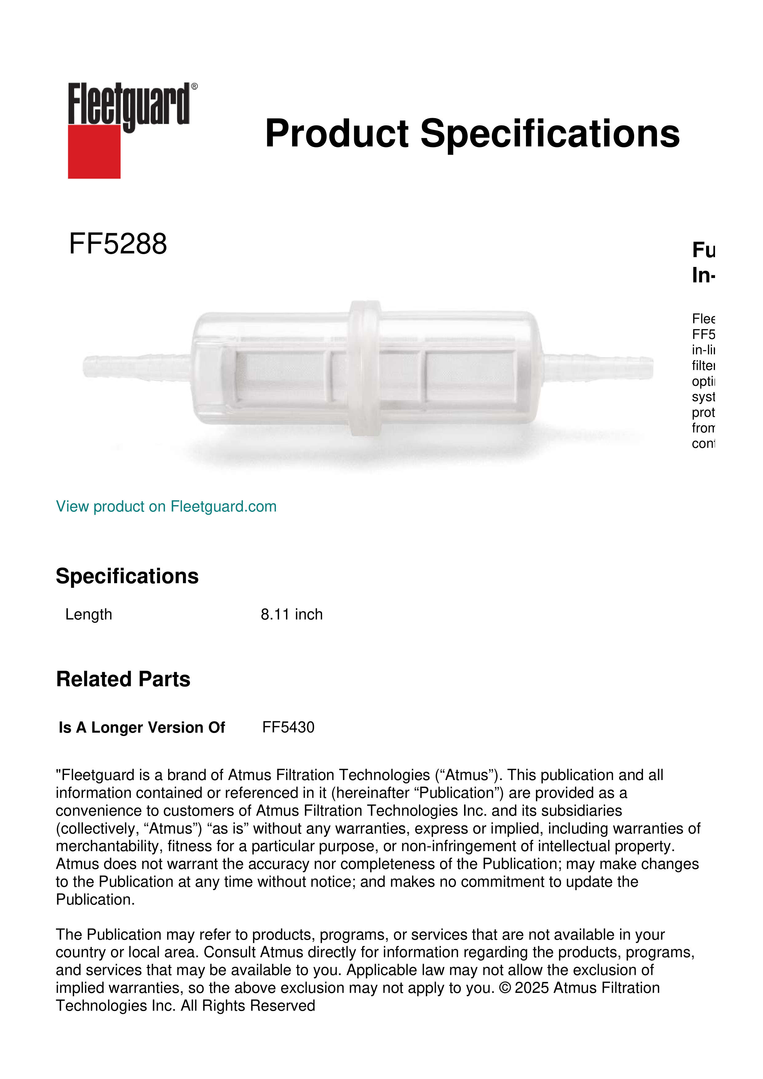 Fleetguard® FF5288 in-line fuel filter ensures optimal fuel system protection from contaminants.Specification