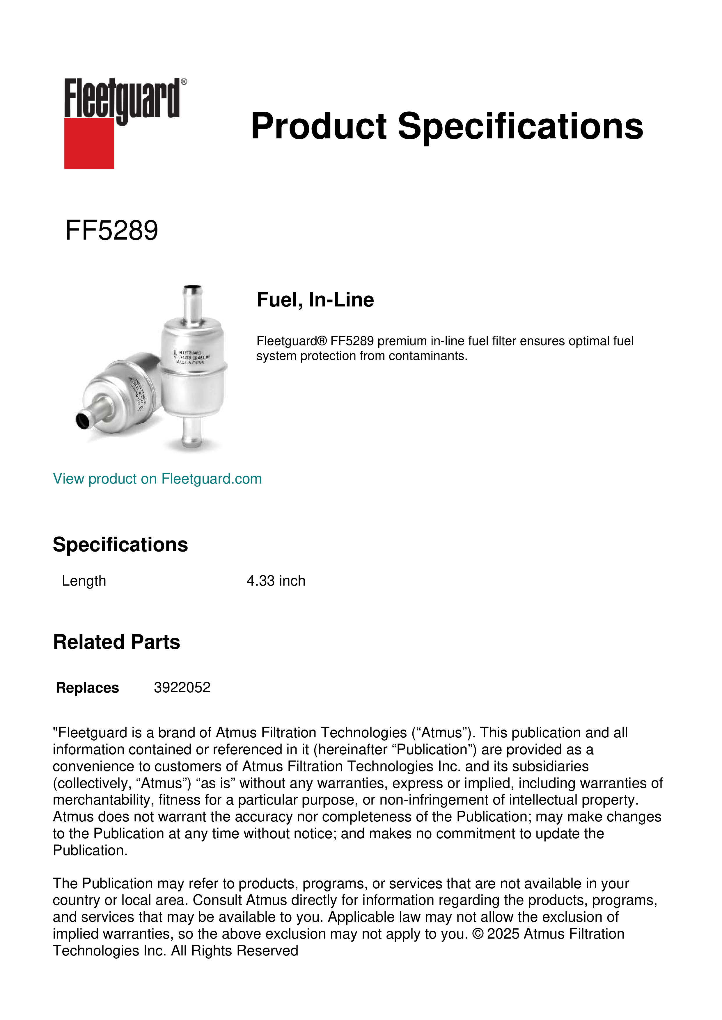 Fleetguard® FF5289 premium in-line fuel filter ensures optimal fuel system protection from contaminants.Specification