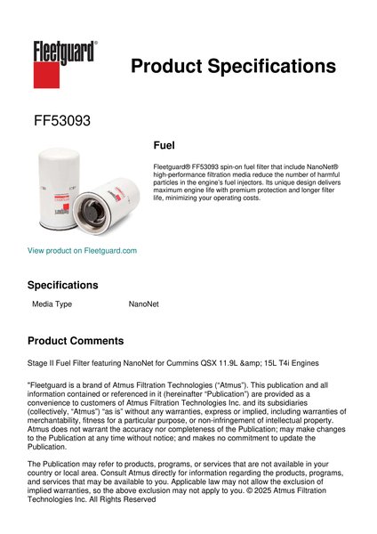 Fleetguard® FF53093 spin-on fuel filter that include NanoNet® high-performance filtration media reduce the number of harmful particles in the engine’s fuel injectors. Its unique design delivers maximum engine life with premium protection and longer filter life, minimizing your operating costs.
