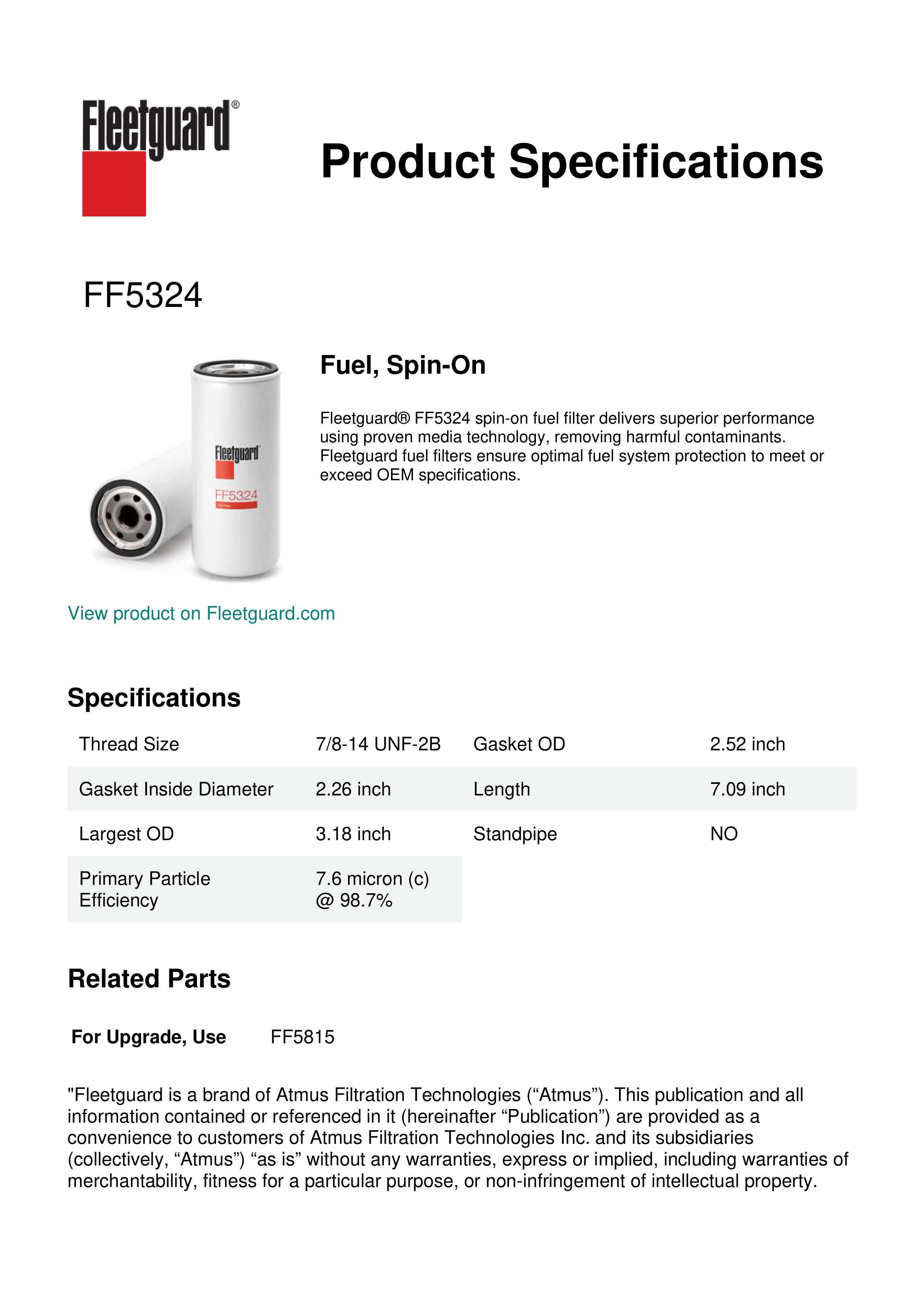 Fleetguard® FF5324 spin-on fuel filter delivers superior performance using proven media technology, removing harmful contaminants. Fleetguard fuel filters ensure optimal fuel system protection to meet or exceed OEM specifications.Specification