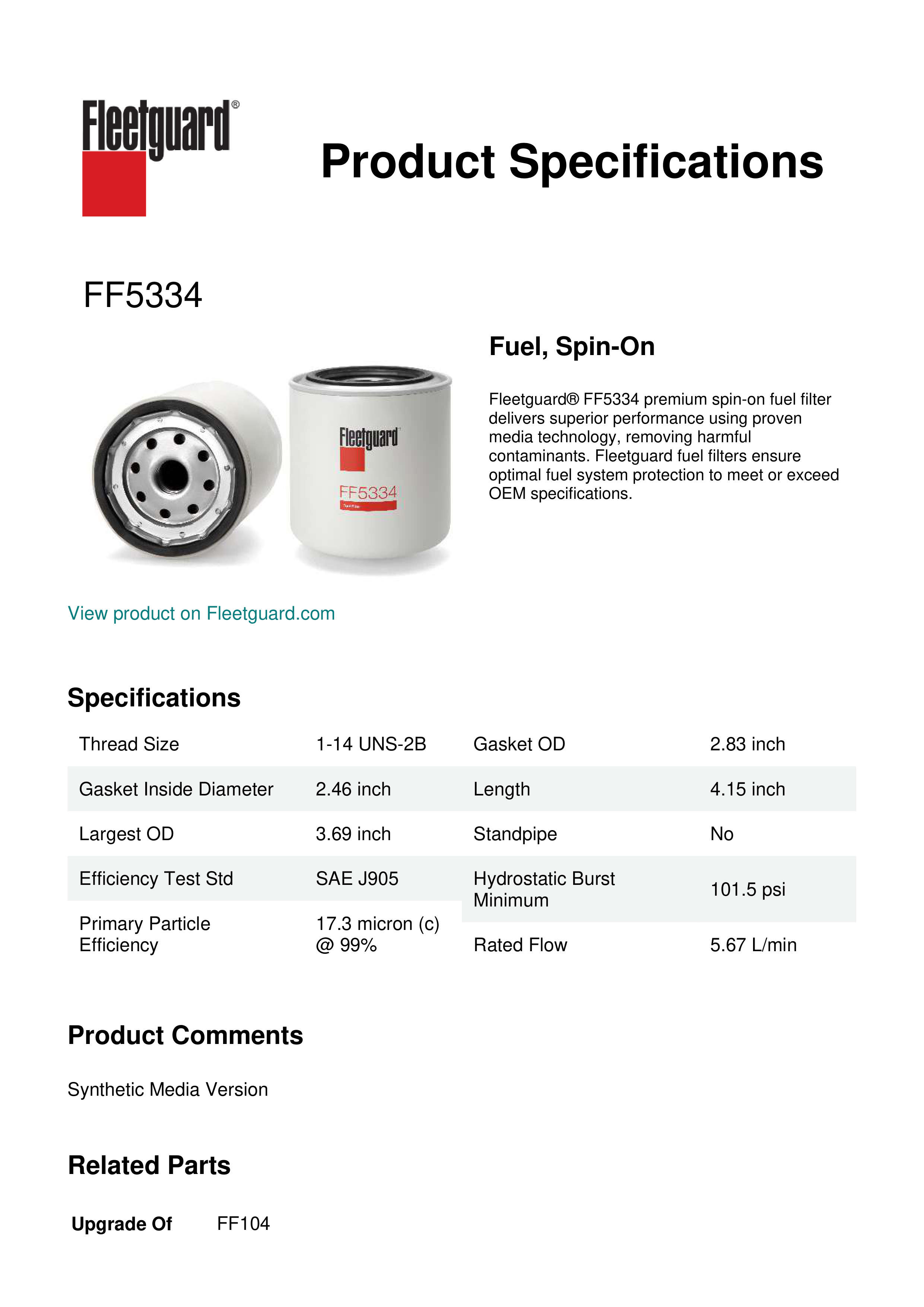 Fleetguard® FF5334 premium spin-on fuel filter delivers superior performance using proven media technology, removing harmful contaminants. Fleetguard fuel filters ensure optimal fuel system protection to meet or exceed OEM specifications.Specification