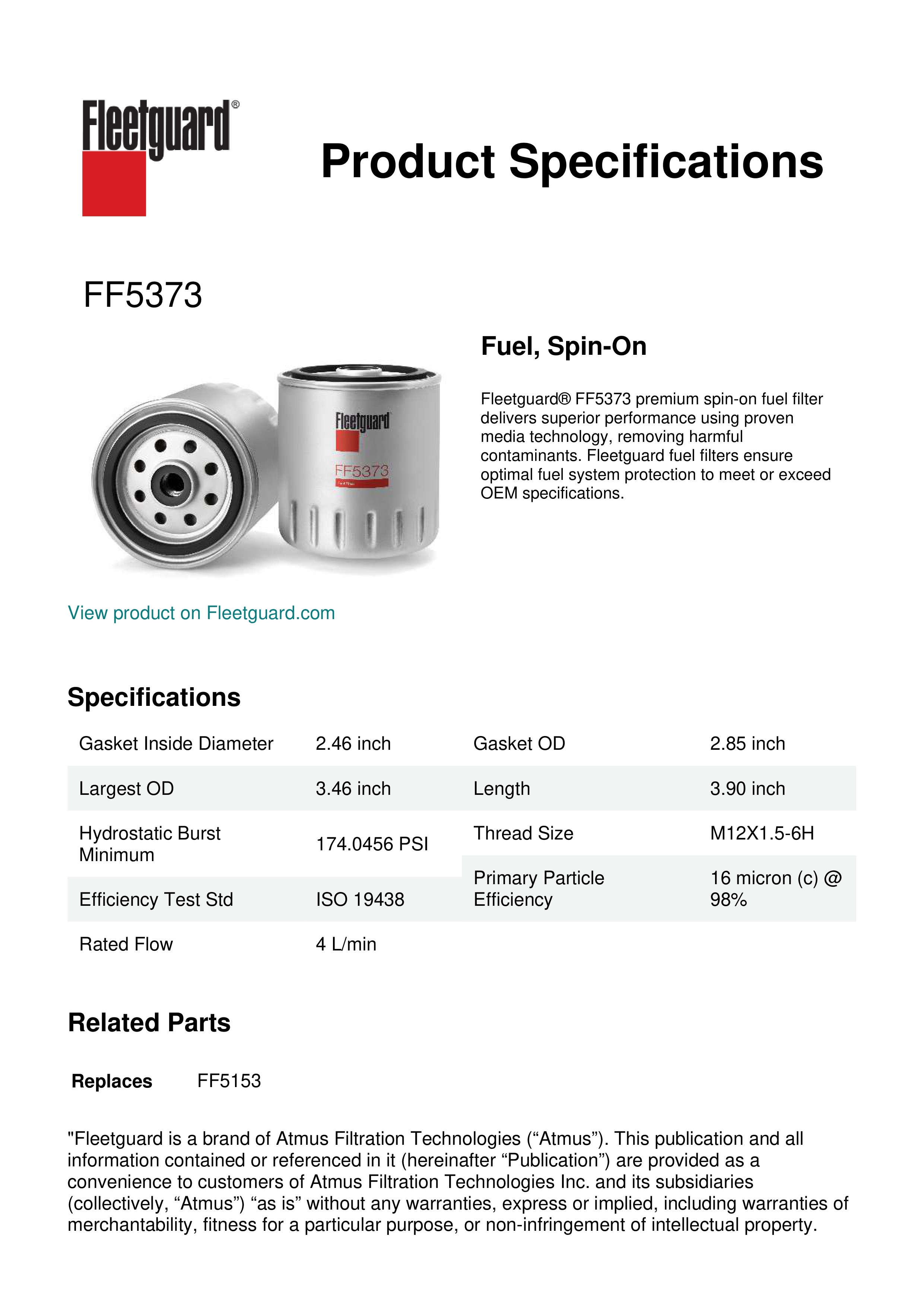 Fleetguard® FF5373 premium spin-on fuel filter delivers superior performance using proven media technology, removing harmful contaminants. Fleetguard fuel filters ensure optimal fuel system protection to meet or exceed OEM specifications.Specification