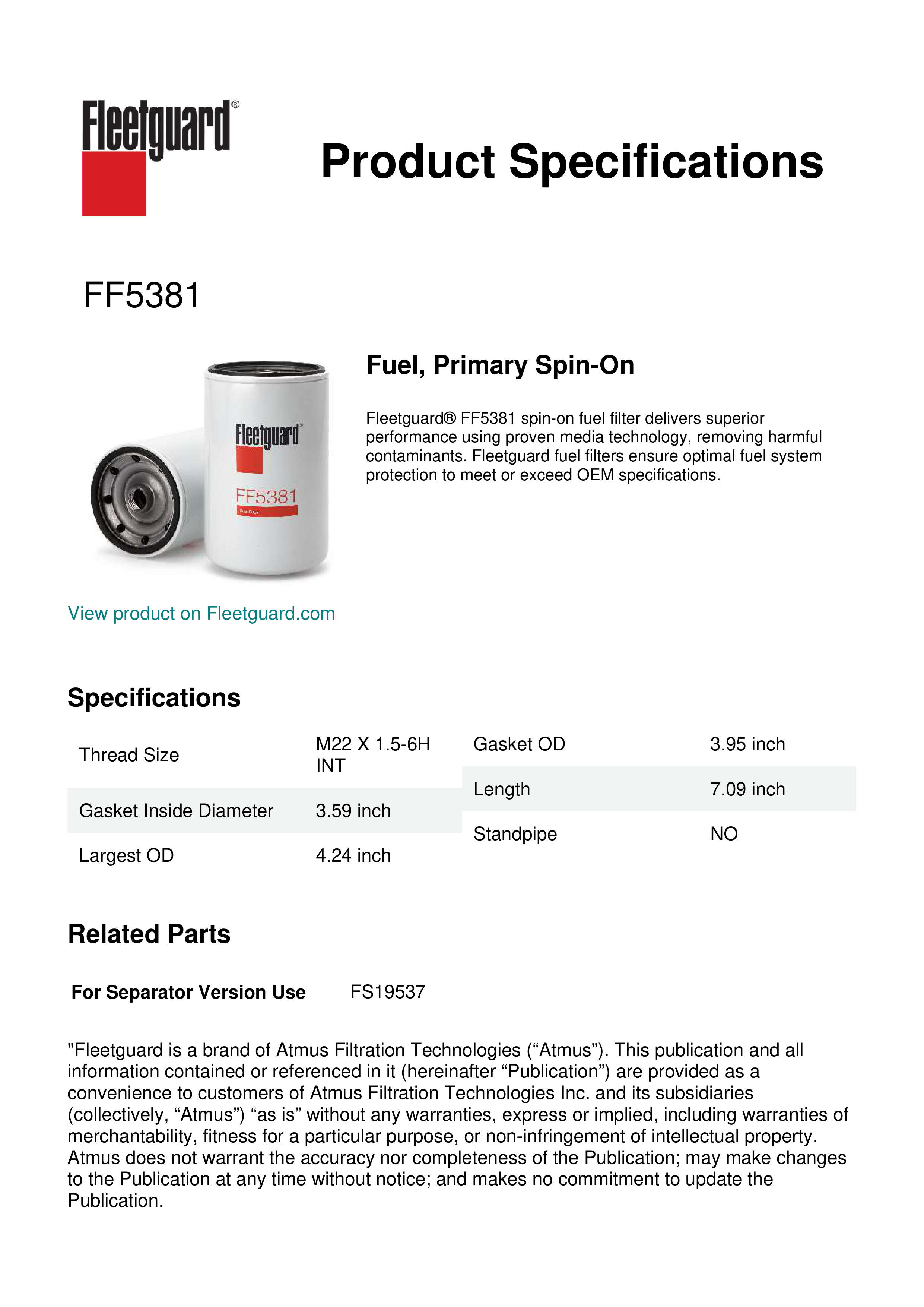 Fleetguard® FF5381 spin-on fuel filter delivers superior performance using proven media technology, removing harmful contaminants. Fleetguard fuel filters ensure optimal fuel system protection to meet or exceed OEM specifications.Specification