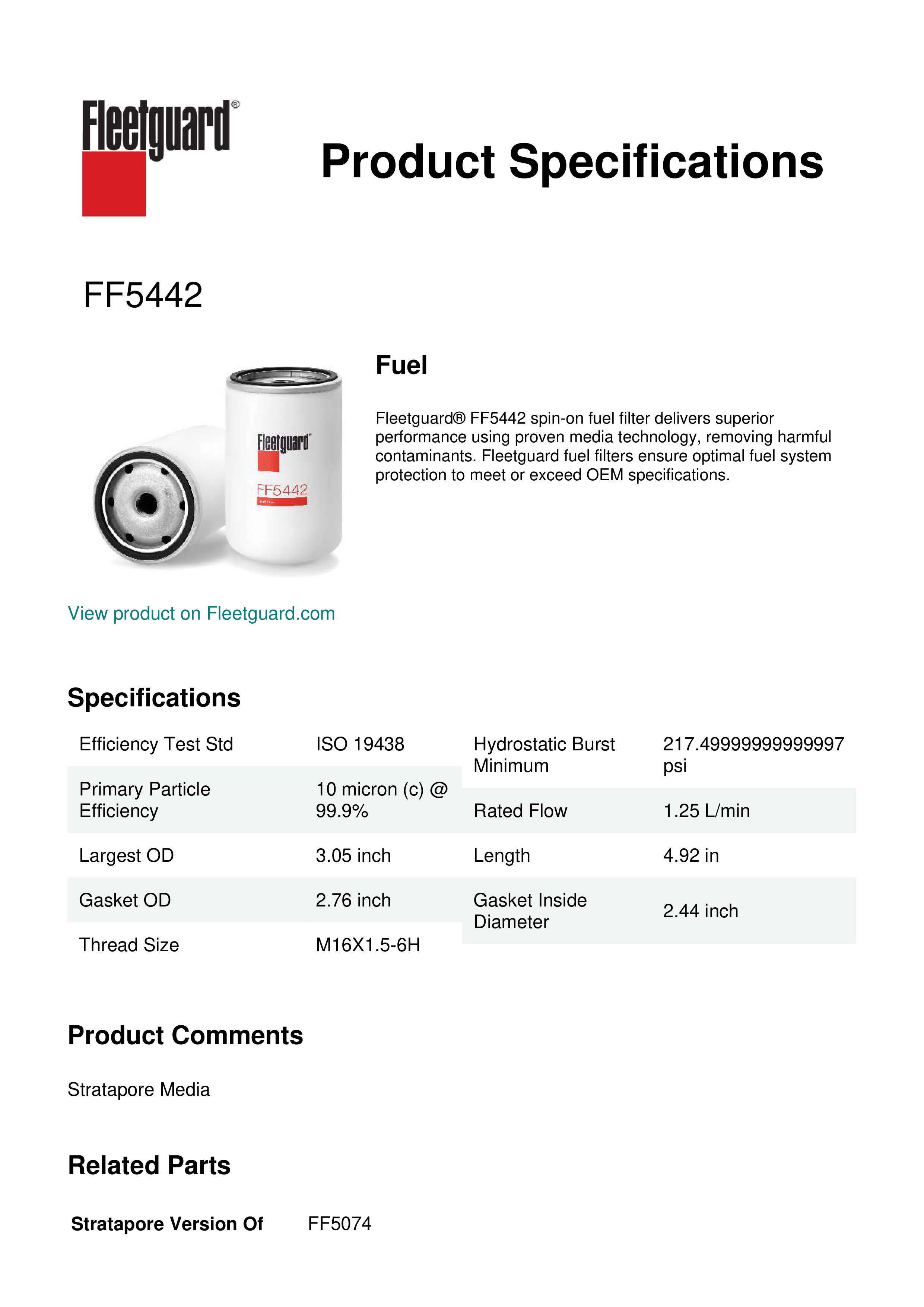 Fleetguard® FF5442 spin-on fuel filter delivers superior performance using proven media technology, removing harmful contaminants. Fleetguard fuel filters ensure optimal fuel system protection to meet or exceed OEM specifications.Specification