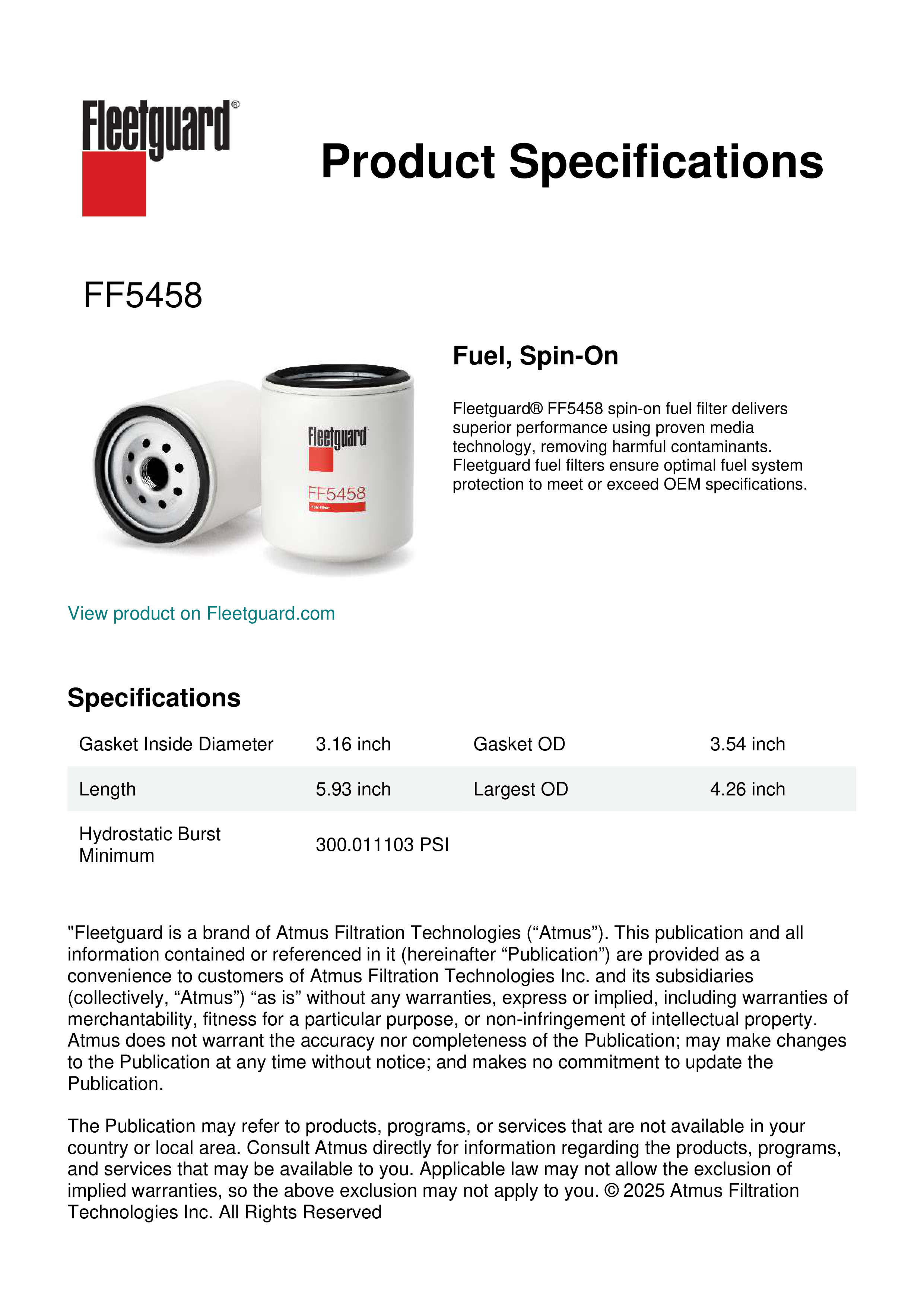 Fleetguard® FF5458 spin-on fuel filter delivers superior performance using proven media technology, removing harmful contaminants. Fleetguard fuel filters ensure optimal fuel system protection to meet or exceed OEM specifications.Specification