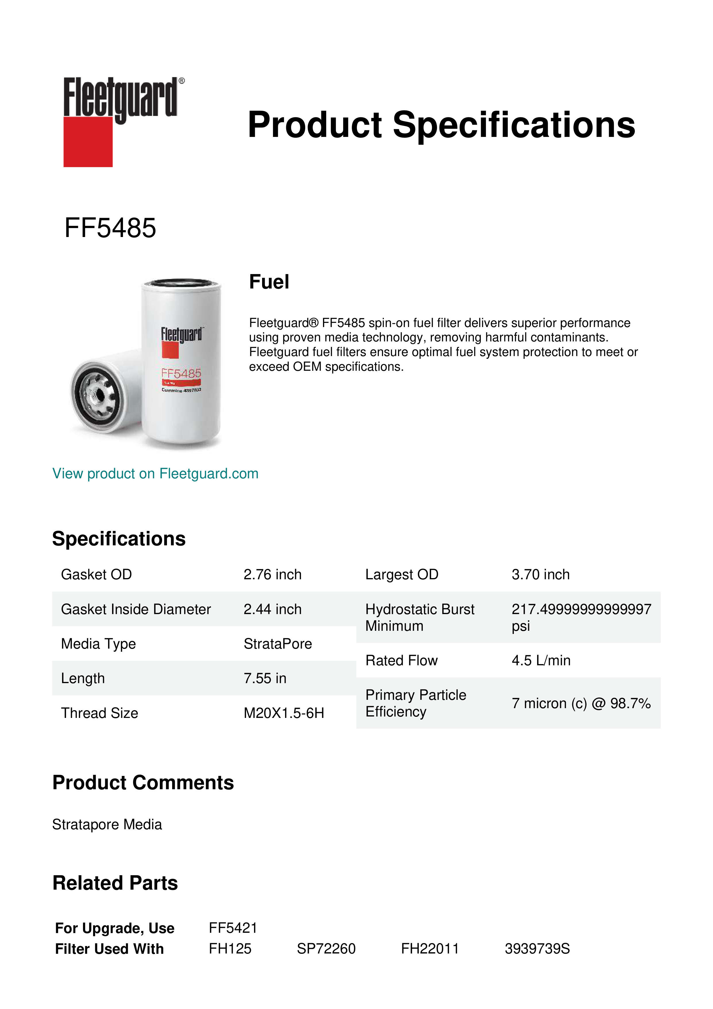 Fleetguard® FF5485 spin-on fuel filter delivers superior performance using proven media technology, removing harmful contaminants. Fleetguard fuel filters ensure optimal fuel system protection to meet or exceed OEM specifications.Specification