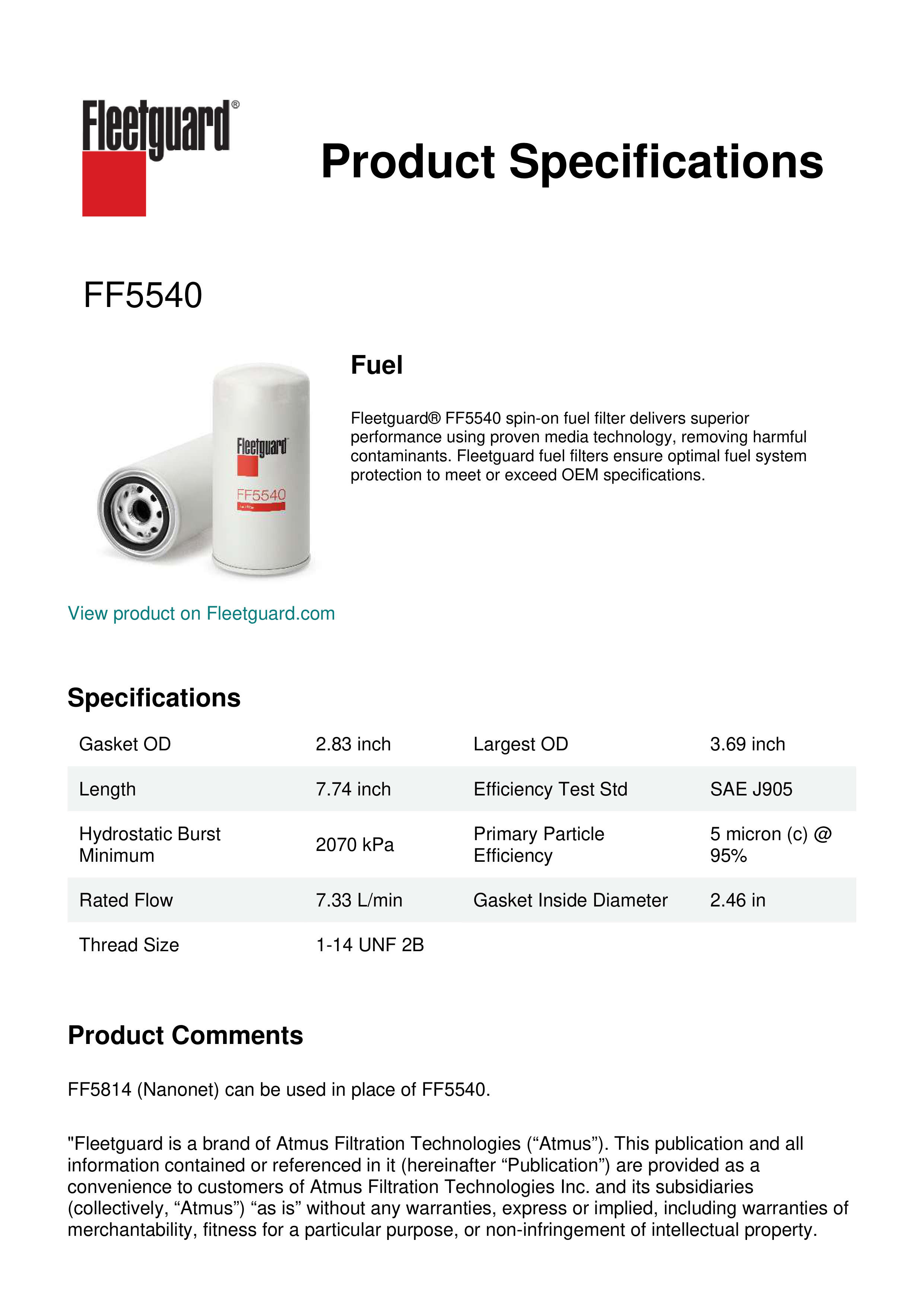 Fleetguard® FF5540 spin-on fuel filter delivers superior performance using proven media technology, removing harmful contaminants. Fleetguard fuel filters ensure optimal fuel system protection to meet or exceed OEM specifications.Specification