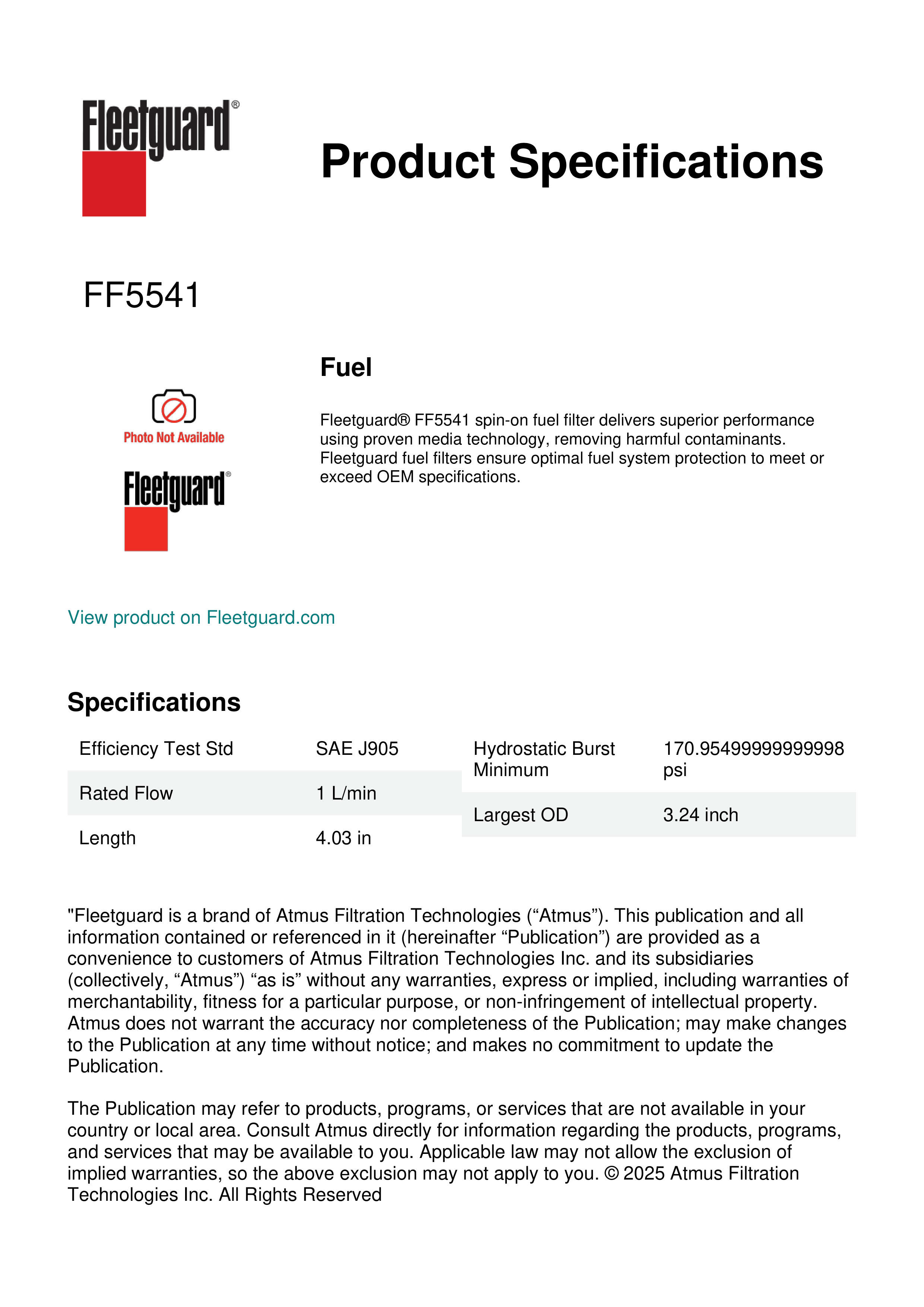 Fleetguard® FF5541 spin-on fuel filter delivers superior performance using proven media technology, removing harmful contaminants. Fleetguard fuel filters ensure optimal fuel system protection to meet or exceed OEM specifications.Specification