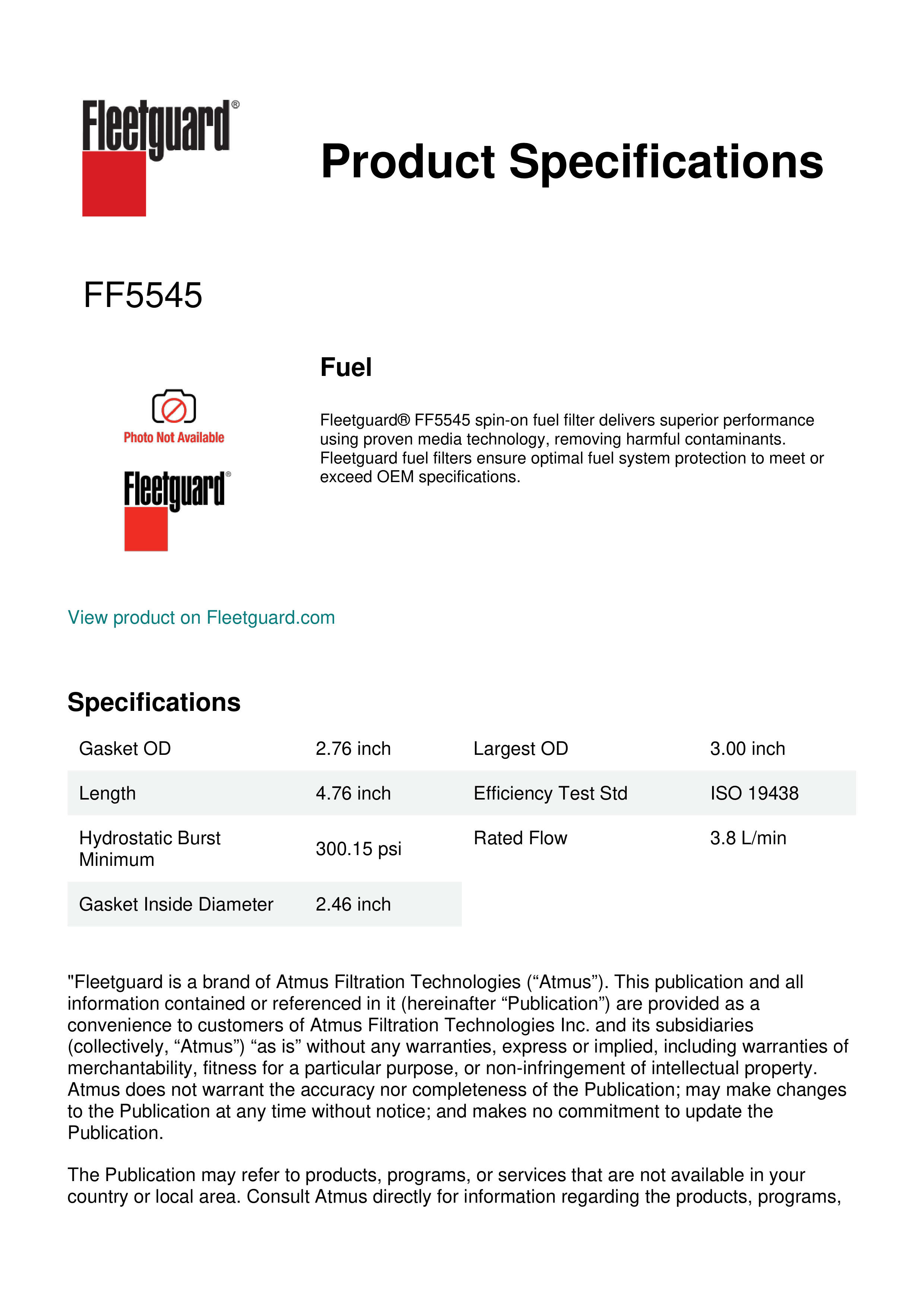 Fleetguard® FF5545 spin-on fuel filter delivers superior performance using proven media technology, removing harmful contaminants. Fleetguard fuel filters ensure optimal fuel system protection to meet or exceed OEM specifications.Specification