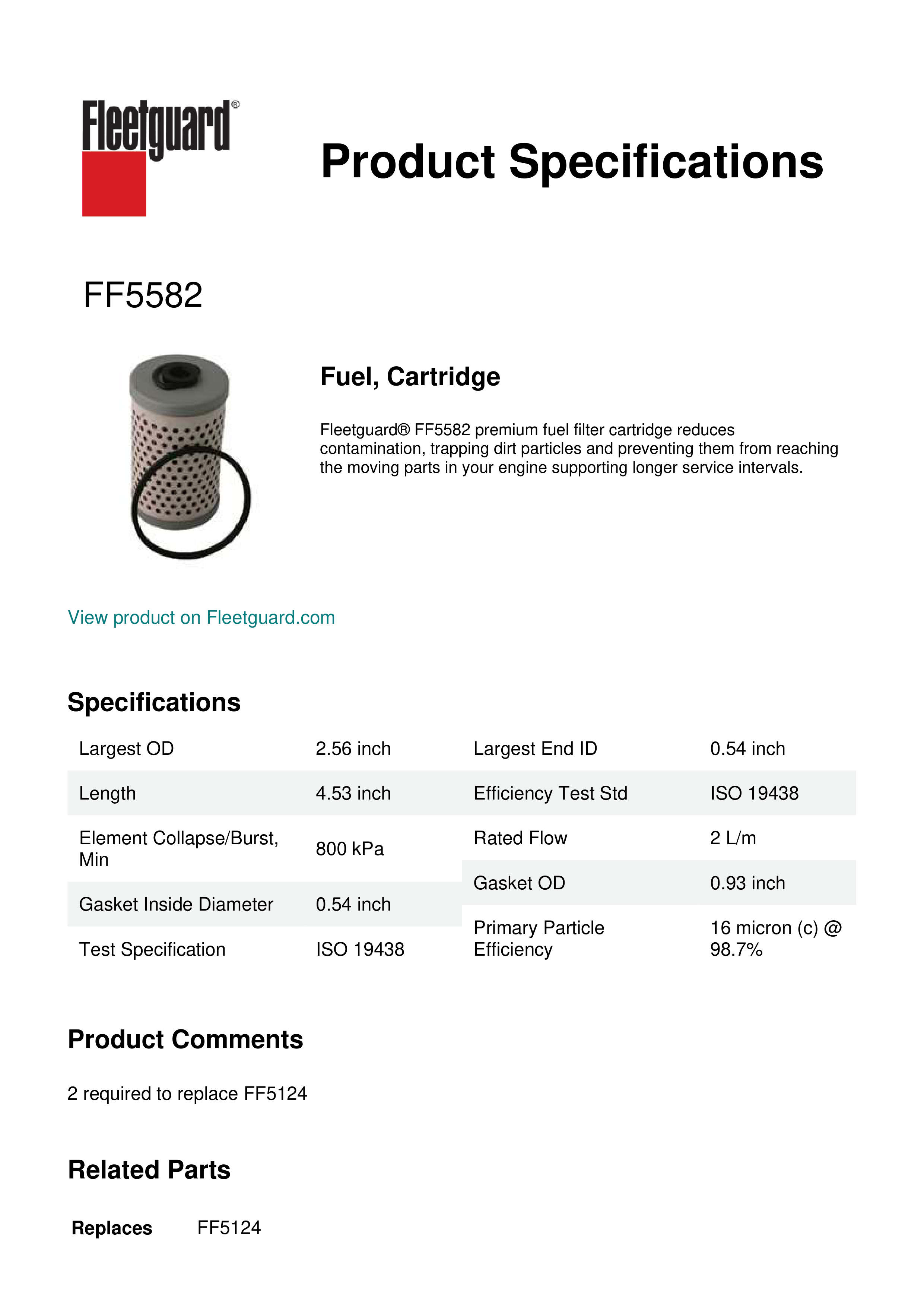 Fleetguard® FF5582 premium fuel filter cartridge reduces contamination, trapping dirt particles and preventing them from reaching the moving parts in your engine supporting longer service intervals.Specification
