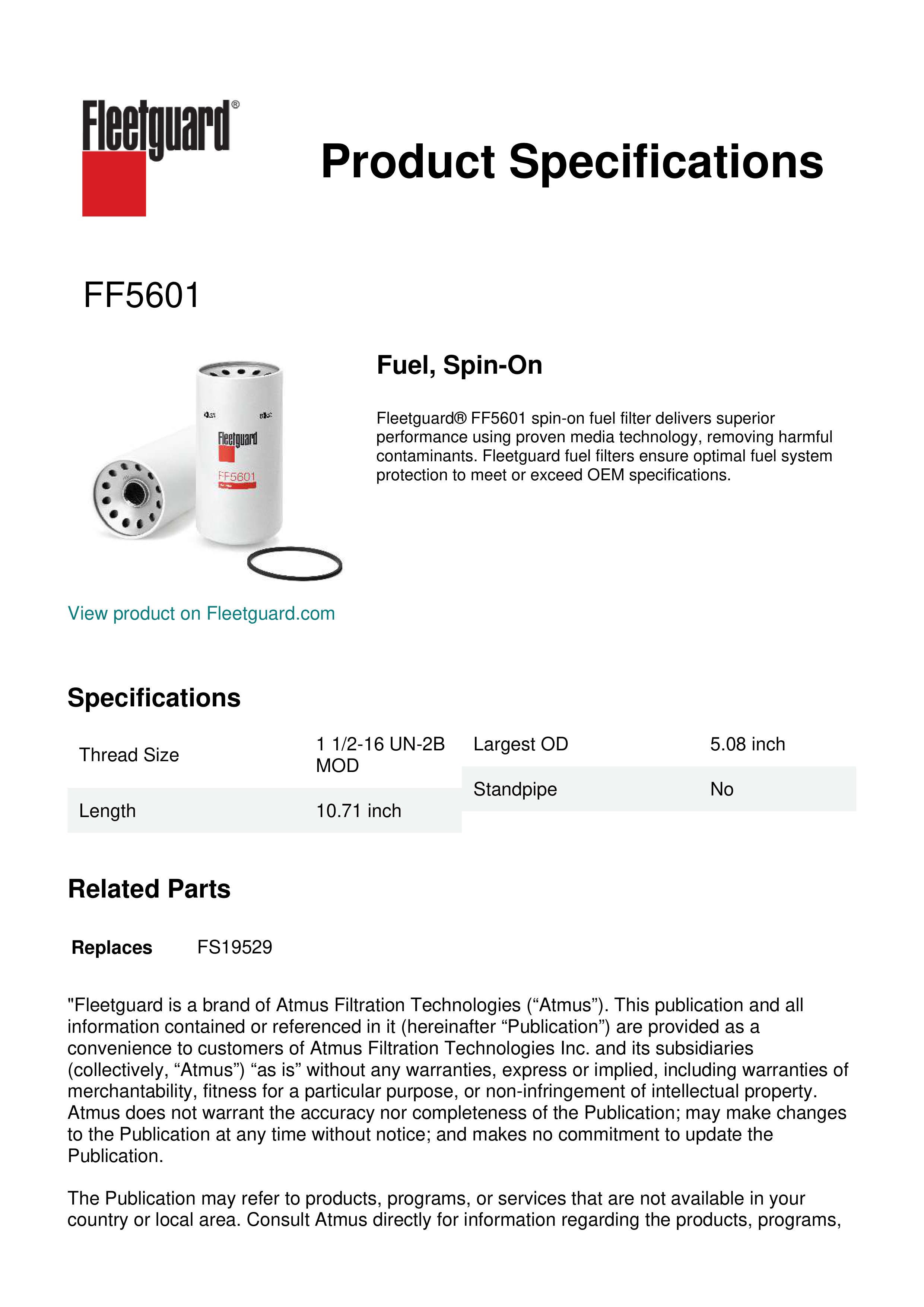 Fleetguard® FF5601 spin-on fuel filter delivers superior performance using proven media technology, removing harmful contaminants. Fleetguard fuel filters ensure optimal fuel system protection to meet or exceed OEM specifications.Specification