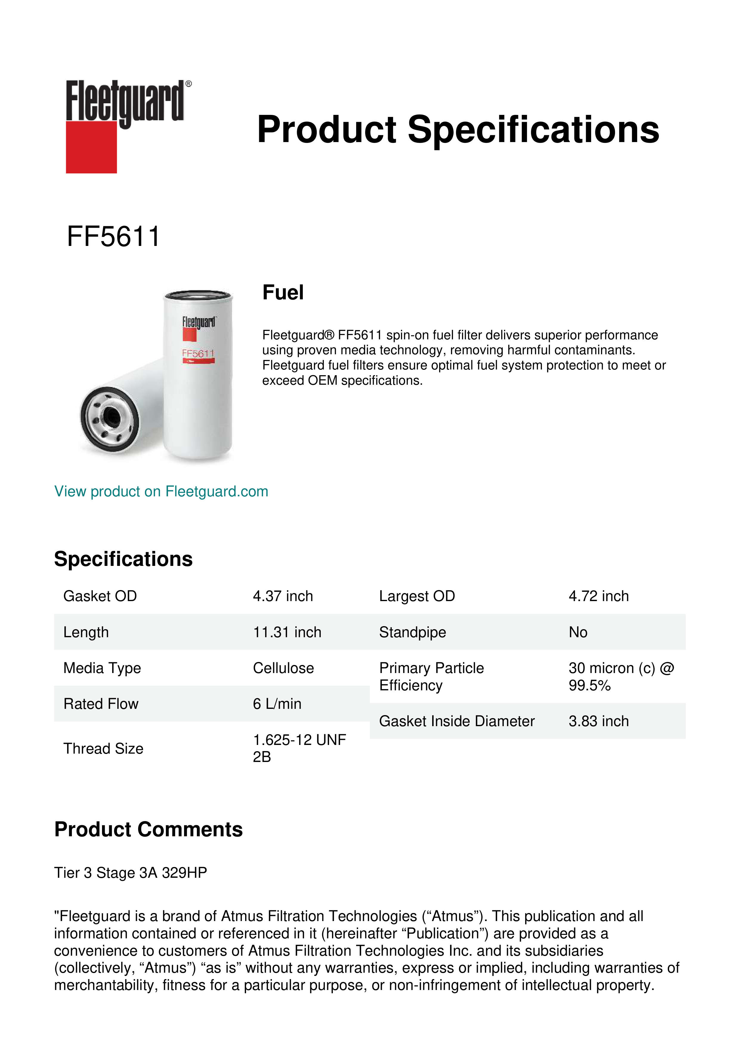 Fleetguard® FF5611 spin-on fuel filter delivers superior performance using proven media technology, removing harmful contaminants. Fleetguard fuel filters ensure optimal fuel system protection to meet or exceed OEM specifications.Specification