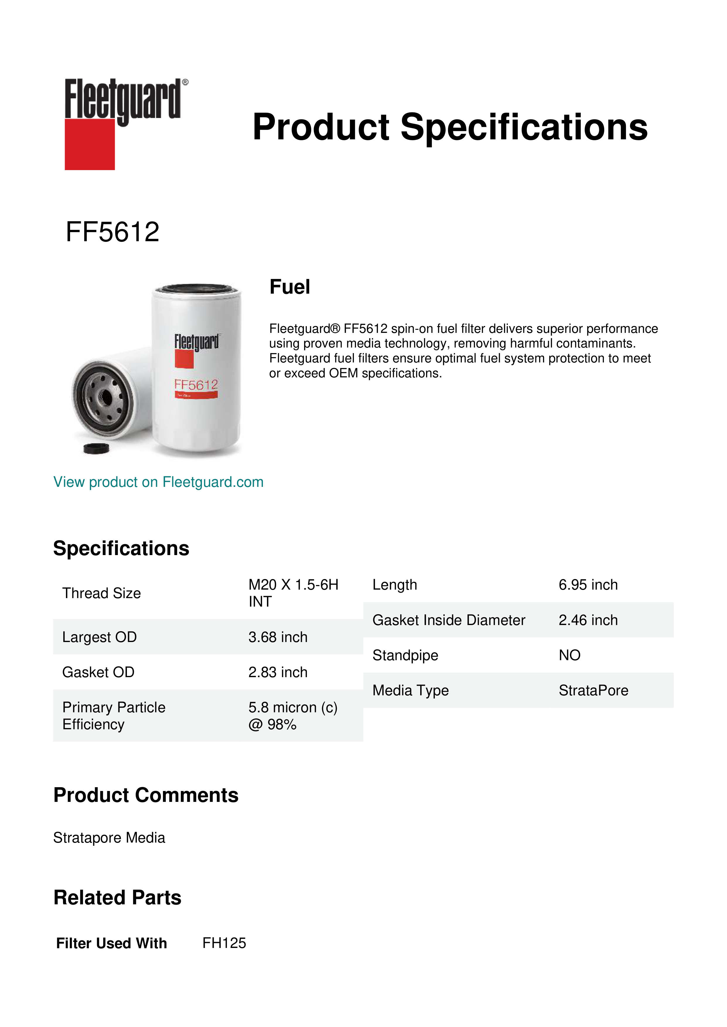 Fleetguard® FF5612 spin-on fuel filter delivers superior performance using proven media technology, removing harmful contaminants. Fleetguard fuel filters ensure optimal fuel system protection to meet or exceed OEM specifications.Specification