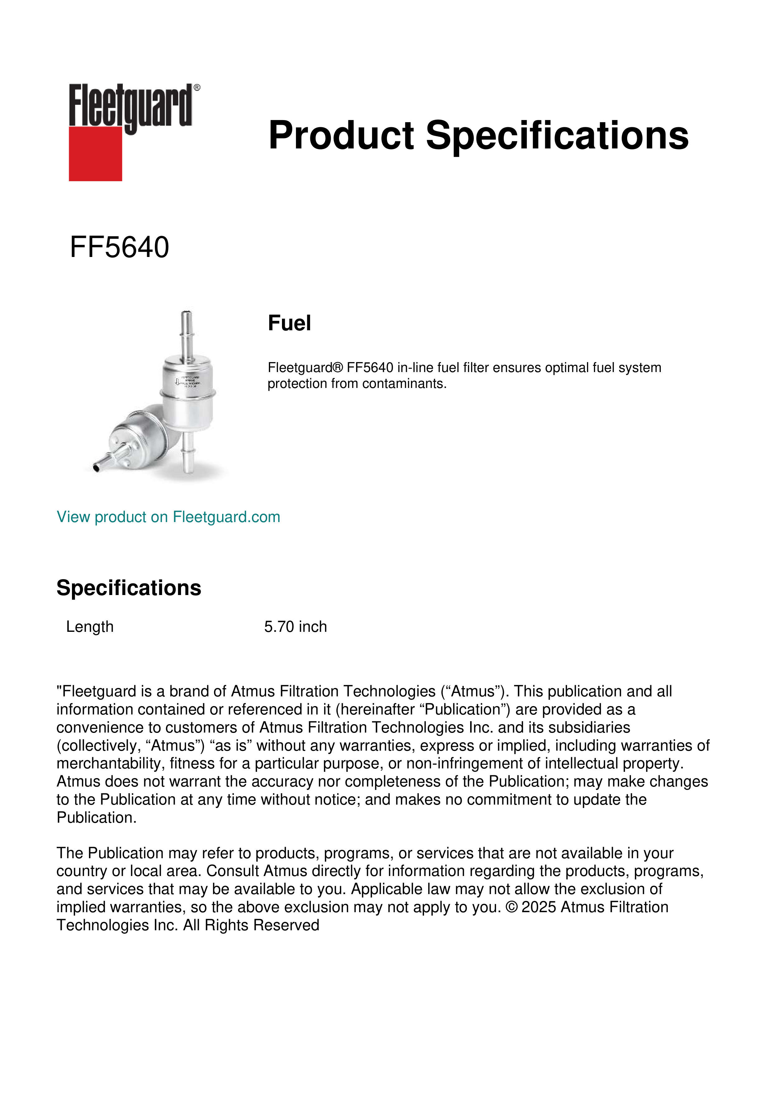 Fleetguard® FF5640 in-line fuel filter ensures optimal fuel system protection from contaminants.Specification