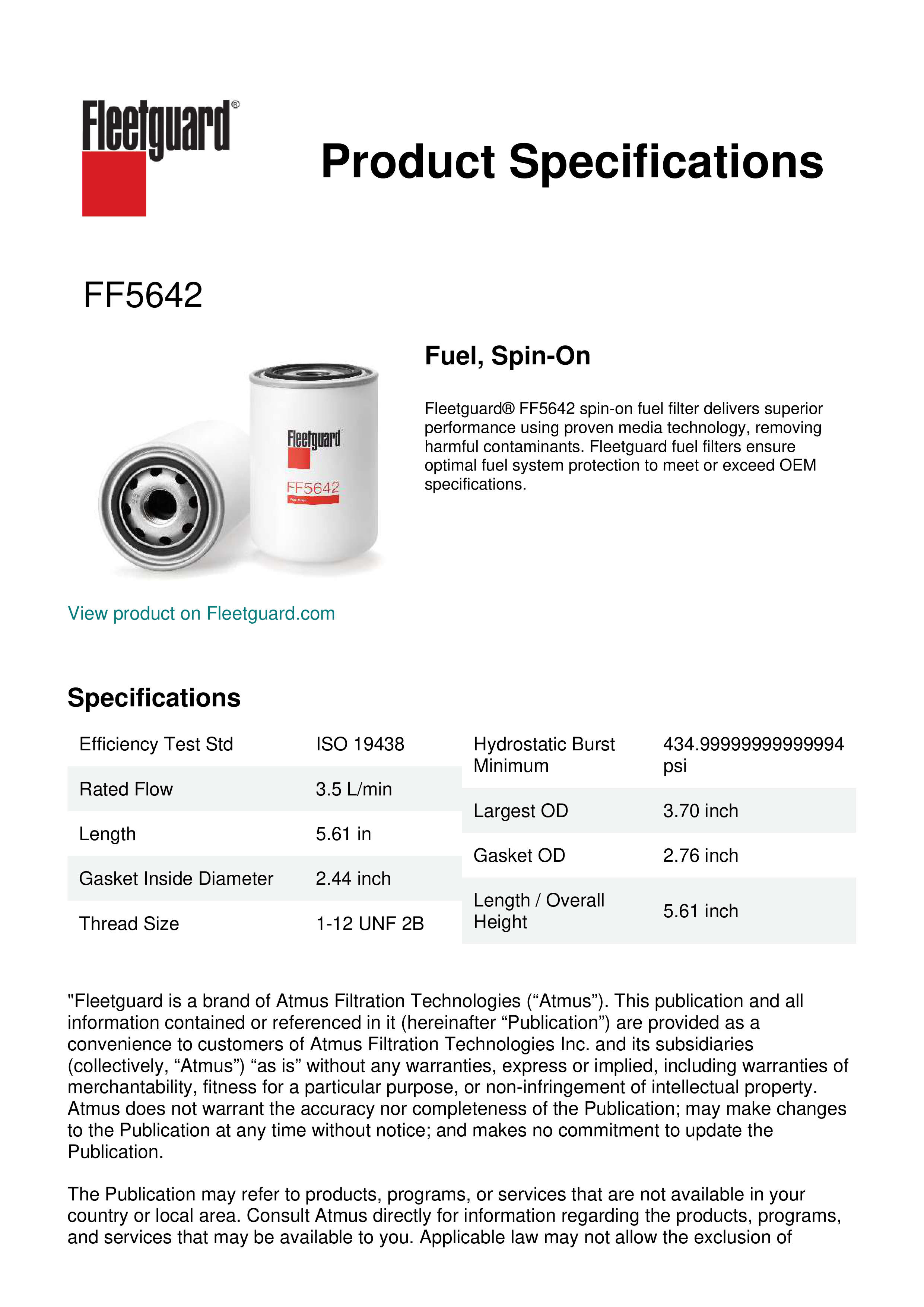 Fleetguard® FF5642 spin-on fuel filter delivers superior performance using proven media technology, removing harmful contaminants. Fleetguard fuel filters ensure optimal fuel system protection to meet or exceed OEM specifications.Specification
