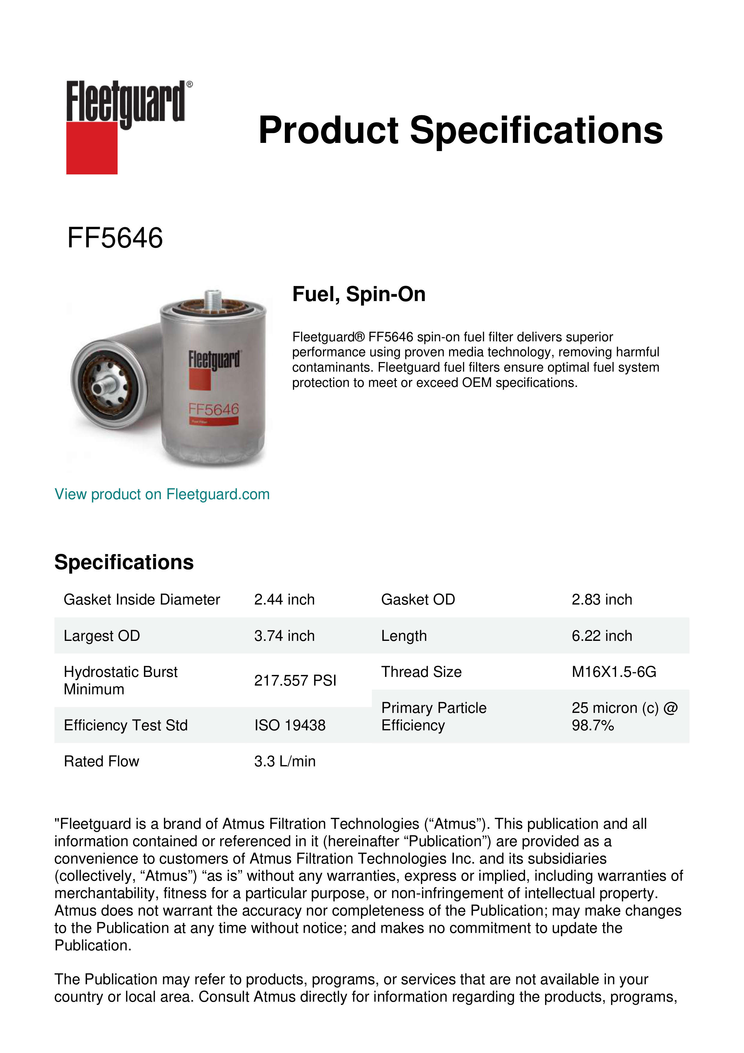 Fleetguard® FF5646 spin-on fuel filter delivers superior performance using proven media technology, removing harmful contaminants. Fleetguard fuel filters ensure optimal fuel system protection to meet or exceed OEM specifications.Specification