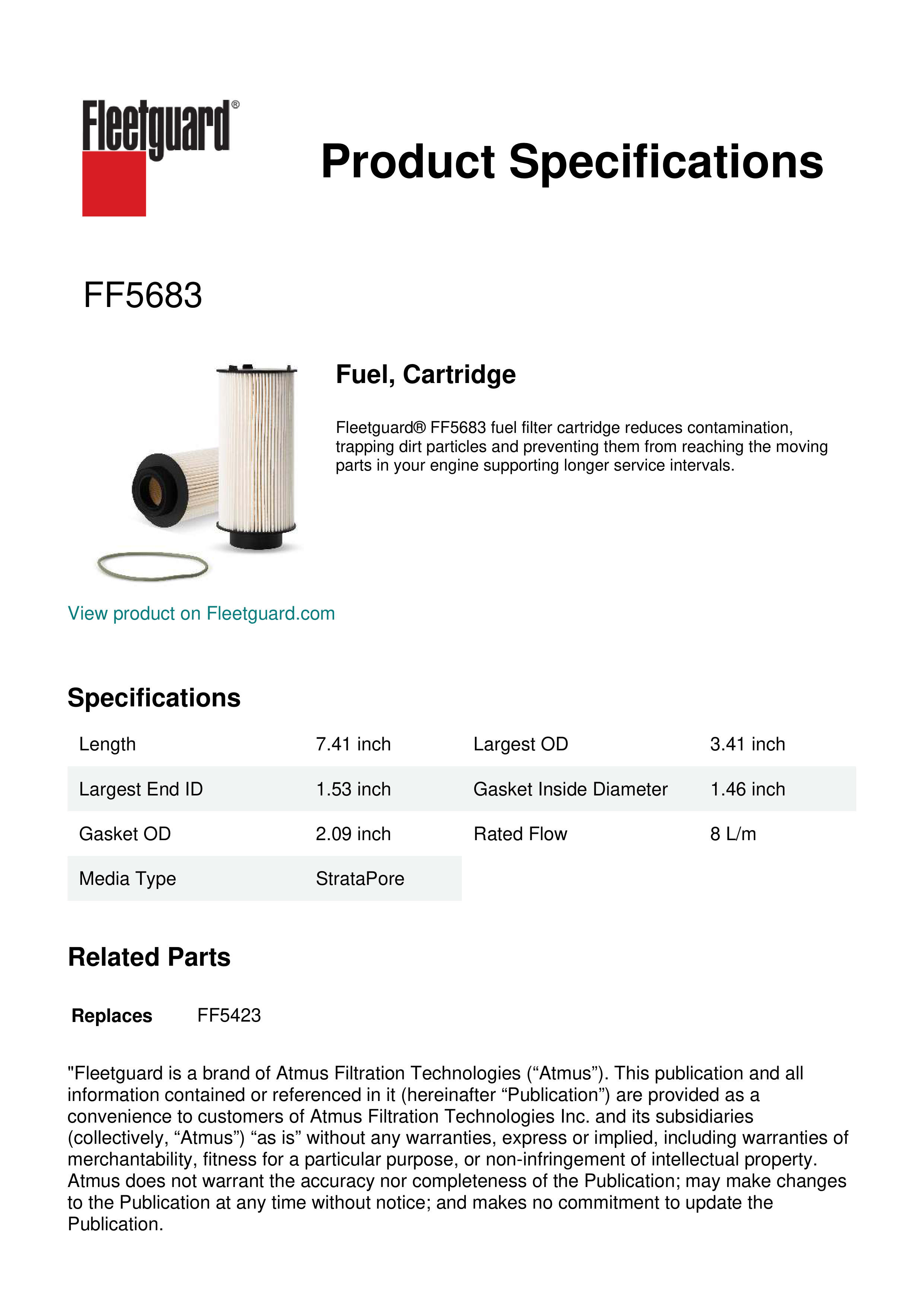 Fleetguard® FF5683 fuel filter cartridge reduces contamination, trapping dirt particles and preventing them from reaching the moving parts in your engine supporting longer service intervals.Specification